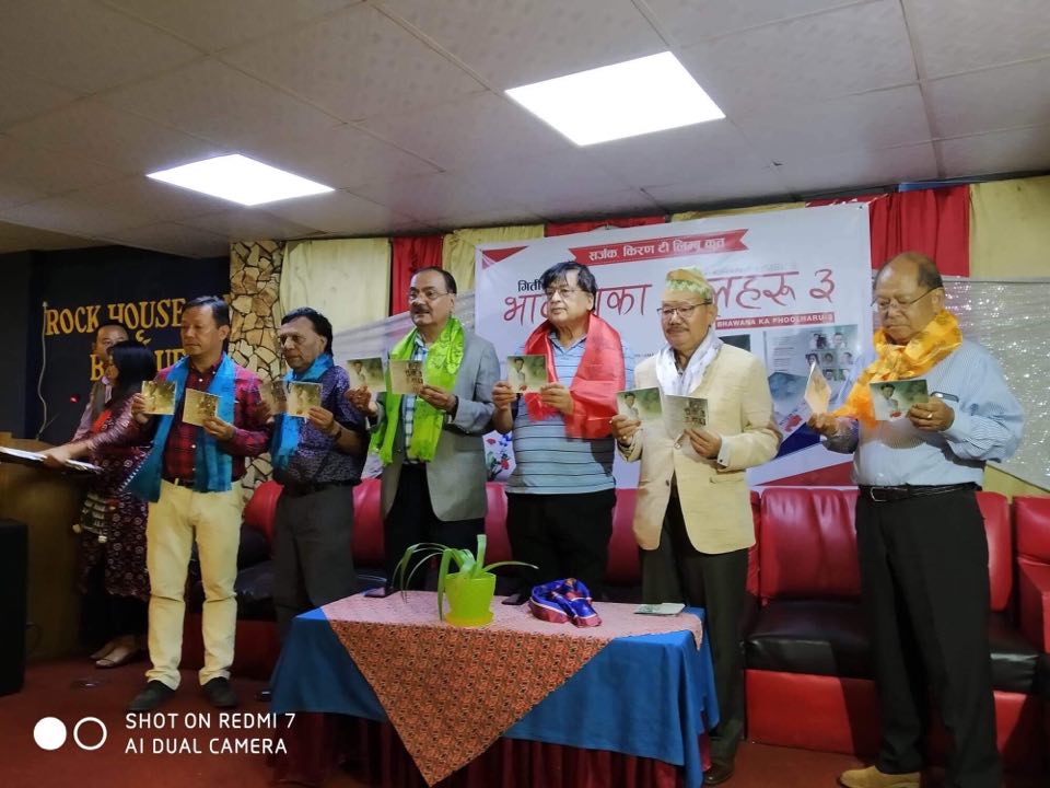 काठमाडौ । गीतकार किरण टी लिम्बुको तेस्रो गीति एल्बम ‘भावनाका फूलहरु–३’ सार्वजनिक भएको छ । गीतकार संघ नेपालले शुक्रबार काठमाडौंमा आयोजना गरेको समारोहमा उक्त एल्बम सार्वजनिक गरिएको हो । वरिष्ठ गीतकार राजेन्द्र थापा, वरिष्ठ गायक तथा संगीतकार गणेश रसिक, वरिष्ठ गीतकार विश्व बल्लभ, संघका अध्यक्ष चुडामणि देवकोटा र मेजर काजीमान लिम्बुले संयुक्त रुपमा विमोचन गरेका हुन् ।