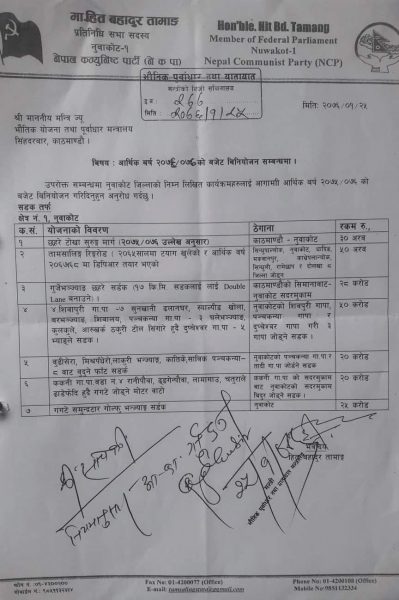 ‘मैले निर्वाचित भएर आएकै वर्षमा ०७५/७६ को वार्षिक कार्यक्रममा पार्नको लागि मागहरु पेस गर्दा पहिलो नम्बरमै राखेर पेस गरेको थिएँ,’ सांसद तामाङले भने, ‘त्यही साल वार्षिक कार्यक्रममा शीर्षक उल्लेख भएर आयो । ०७६/०७७को वार्षिक कार्यक्रमको लागि पनि फेरि १ नम्बरमै राखेर माग गरेको थिएँ । डिपिआरको लागि भनेर ४०लाख बजेट छुट्टिएर आएको छ ।’ उनले थपे, ‘मागपत्र पेस गर्दा यसको महत्त्वबारे जति सोचेका थियौं अहिले यसको महत्त्व धेरै गुणा बढेको महसुस भएको छ।’ शनिबार र आइतबार चिनियाँ राष्ट्रपति सीको नेपाल भ्रमणका क्रममा टोखा-छहरे सुरुङ मार्ग निर्माण लगायत दुई देशबीच डेढ दर्जन बढी समझदारी भएका थिए ।