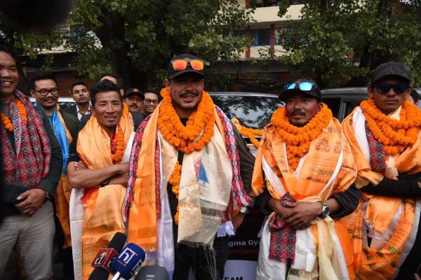नेपाल पर्वतारोहण सङ्घको नेतृत्वमा पञ्चेबाजा र नेपाल प्रहरीको ब्यान्डबाजासहित स्वागत गरिएको थियो । कीर्तिमानी आरोही पुर्जाको आरोही टिमका मिङ्मा डेभिड शेर्पा, ग्याल्जेन शेर्पा र जेसमान तामाङ आरोहण पूरा गरी आजै अपराह्न विमानस्थल आइपुगेका थिए ।