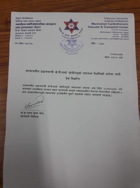 प्रधानमन्त्री ओलीको स्वास्थ्य अवस्थाका बारेमा बुधबार साँझ ७ बजे सेन्टरका कार्यकारी निर्देशक प्रा डा उत्तमकृष्ण श्रेष्ठले जारी गरेका प्रेस विज्ञप्तिमा उनको स्वास्थ्यमा उल्लेखनीय सुधार आएको उल्लेख छ । विज्ञप्तिमा भनिएको छ, ‘मङ्गलबार शल्यक्रियापश्चात् सघन उपचारको सम्पूर्ण व्यवस्थासहित निरन्तर निगरानीमा राखिएको र हाल सम्माननीयज्यूको स्वास्थ्यमा उल्लेखनीय सुधार भइरहेको व्यहोरा जानकारी गराइन्छ ।’ यसअघि सेन्टरले जारी गरेको विज्ञप्तिमा प्रधानमन्त्री ओली राम्रोसँग कुराकानी गर्नसक्ने अवस्थामा भएको उल्लेख थियो ।