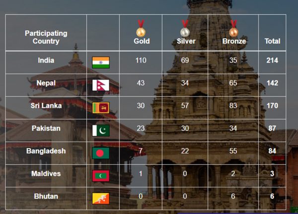 ३० स्वर्णसहित श्रीलंका तेस्रो र २३ स्वर्णसहित पाकिस्तान चौथो स्थानमा छन्। ७ स्वर्ण बटुलेको बंगलादेश अंक तालिकाको पाँचौं स्थानमा छ।