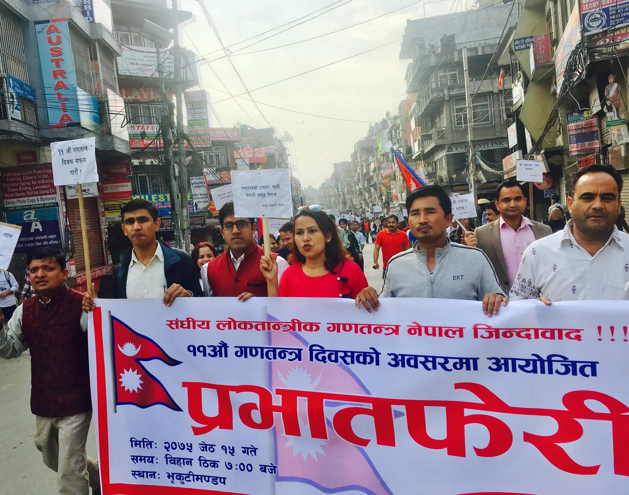 काठमाडौं । गणतन्त्र दिवसको सन्दर्भमा संयुक्त विद्यार्थी संगठनले मंगलबार यहाॅ प्रभातफेरि कार्यक्रम गरेका छन्। विद्यार्थी संगठनहरुले भृकुटीमण्डपमा जम्मा भइ पुतलीसडक हुँदै शान्तिवाटिका पुगेर कोणसभा गरी कार्यक्रमको समापन गरेको अखिल(क्रान्तिकारी)का उपाध्यक्ष सुरेन्द्र बस्नेतले जानकारी दिए।