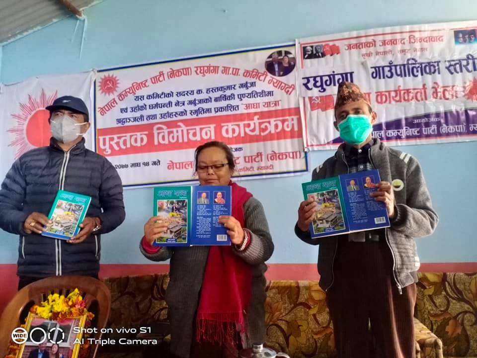 कोभिड १९ को कारणले गर्दा स्मृतिग्रन्थ बिमोचन कार्यक्रम बिभिन्न स्थानहरुमा गरिएको तथा गरिने भएको छ। गत २७ जनवरी २०२१ का दिन नेपाल कम्युनिष्ट पार्टी रघुगंगा गाउँ कमिटिका पदाधिकारीहरुले रघुगंगा गाउँ पालिका २ भगवतीस्थित रानीपौवामा उक्त स्मृतिग्रन्थ बिमोचन गरेका थिए। अध्यक्ष दिपक कार्की (बिखर्ची), पुर्ब मन्त्रि थाम माया थापा, पुर्ब संबिधान सभाका सभासद नबराज शर्मा, म्याग्दी जिल्लाका पुर्ब एमाले अध्यक्ष हरिकृष्ण श्रेष्ठ, युवा संघ नेपालका केन्द्रिय सदस्य नारायण जिसीको हातबाट संयुक्त रुपमा उक्त बिमोचन कार्यक्रम सम्पन्न भएको छदिपक बिखर्चिले अध्यक्षता गरेको कार्यक्रमलाई नेता गम पुनले स्वागत मन्तब्य दिएका थिए भने प्रबक्ता चन्द्रमान छन्त्यालले संचालन गरेका थिए ।