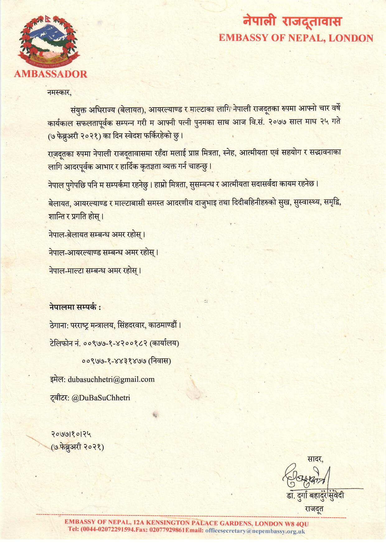 नेपाल फर्कनुअघि दूतावासमार्फत पत्र लेख्दै राजदूत सुवेदीले नेपाली राजदूतावासमा रहँदा आफूले प्राप्त मित्रता, आत्मीयता, एवं सहयोग र सद्भावका लागि आभार तथा कृतज्ञता प्रकट गरेका छन् । उनले आफू नेपाल पुगेपछि पनि सम्पर्कमा रहने जनाउँदै मित्रता, सुसम्बन्ध, आत्मीयता सदासर्वदा कायम रहने विश्वास दिलाएका छन् ।