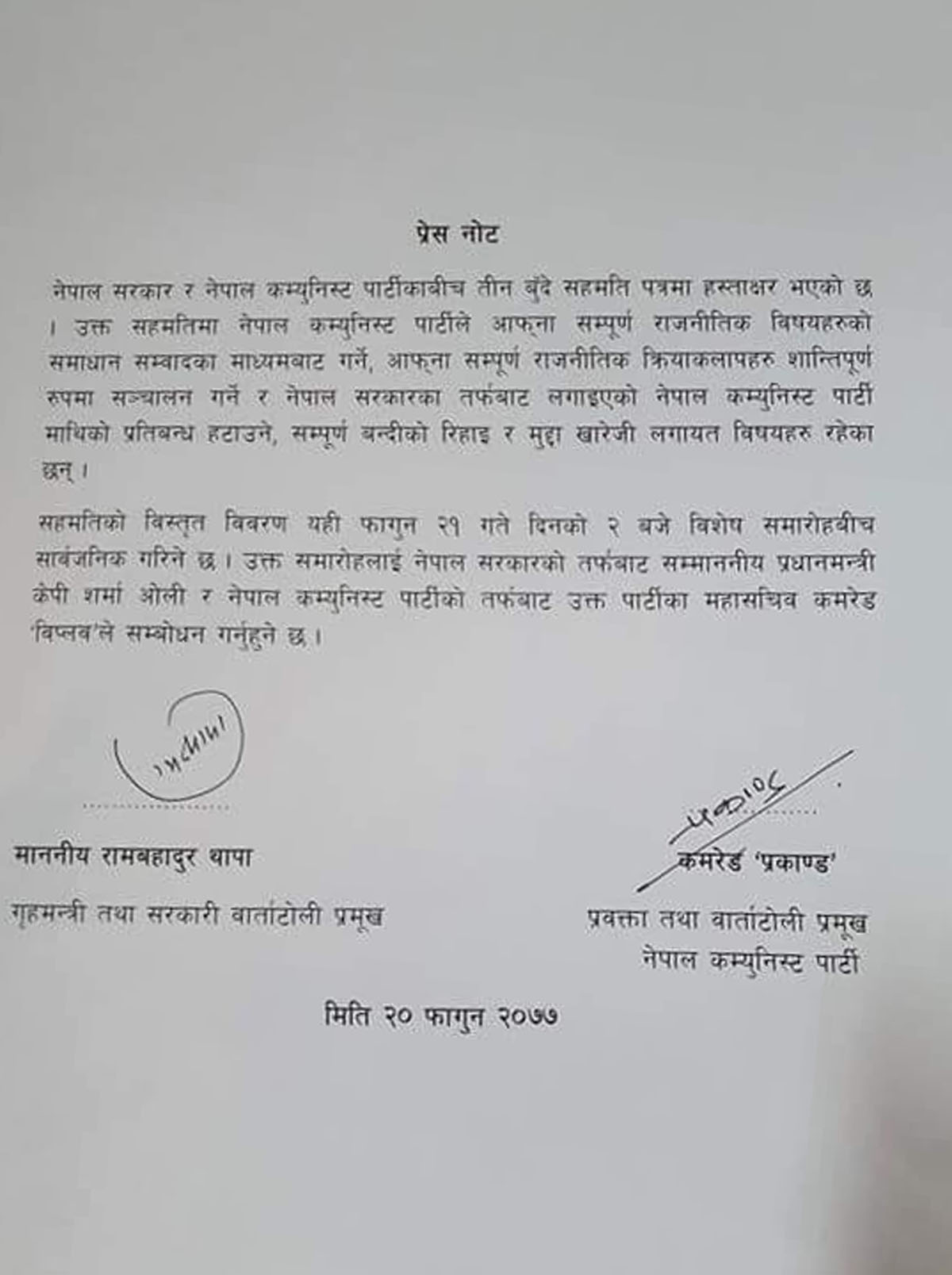 सरकारी वार्ता टोलीका संयोजक गृहमन्त्री रामबहादुर थापा र चन्द समूहको वार्ता टोलीका संयोजक खड्गबहादुर विश्वकर्माले बिहीबार संयुक्त विज्ञप्ति जारी गरी सहमति भएको पत्र सार्वजनिक गरे ।