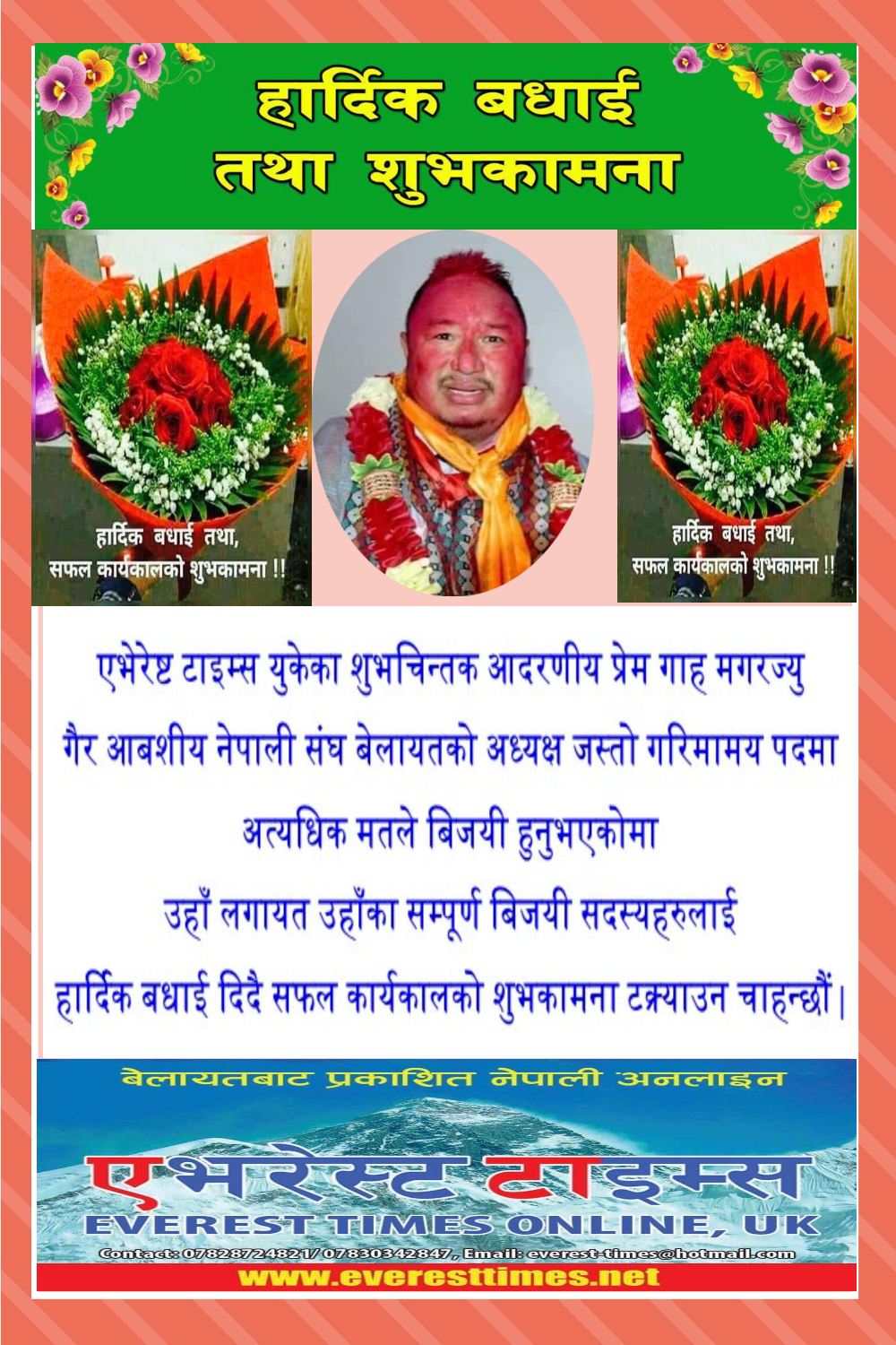 एभेरेष्ट टाइम्स युकेका शुभचिन्तक आदरणीय प्रेम गाह मगरज्यु गैर आबशीय नेपाली संघ बेलायतको अध्यक्ष जस्तो गरिमामय पदमा अत्यधिक मतले बिजयी हुनुभएकोमा उहाँ लगायत उहाँका सम्पूर्ण नब निर्वाचित सदस्यहरुलाई हार्दिक बधाई दिदै सफल कार्यकालको शुभकामना टक्र्याउन चाहन्छौं