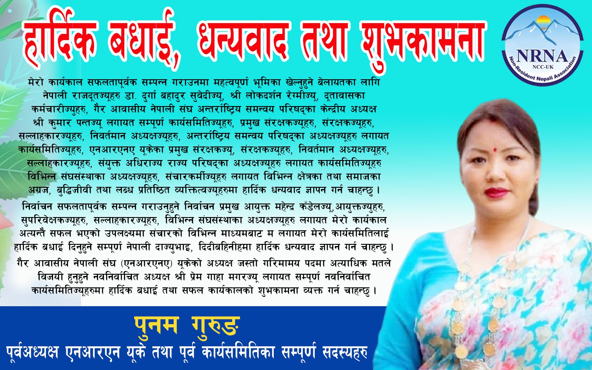 हार्दिक बधाई, धन्यवाद तथा शुभकामना: पुनम गुरुङ पुर्ब अध्यक्ष एनआरएन युके
