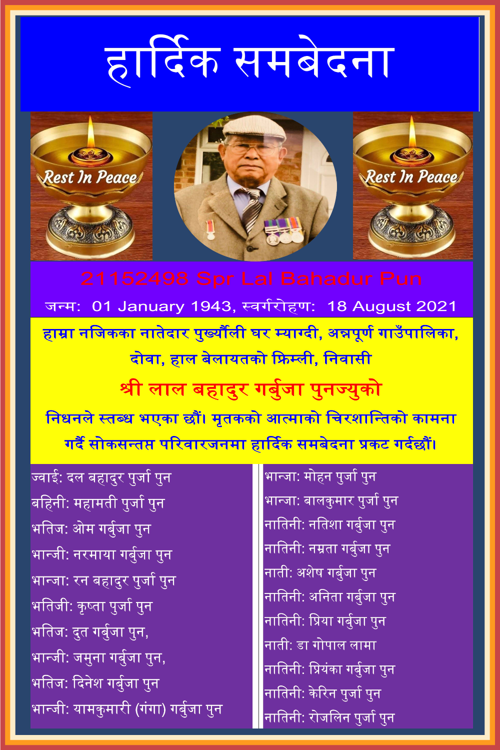 हाम्रा नजिकका नातेदार पुर्ख्यौली घर, म्याग्दी, अन्नपूर्ण गाउँपालिका, दोवा, हाल बेलायतको फ्रिम्ली, निवासी श्री लाल बहादुर गर्बुजा पुनज्युको निधनले स्तब्ध भएका छौं। मृतकको आत्माको चिरशान्तिको कामना गर्दै सोकसन्तप्त परिवारजनमा हार्दिक समबेदना प्रकट गर्दछौं।