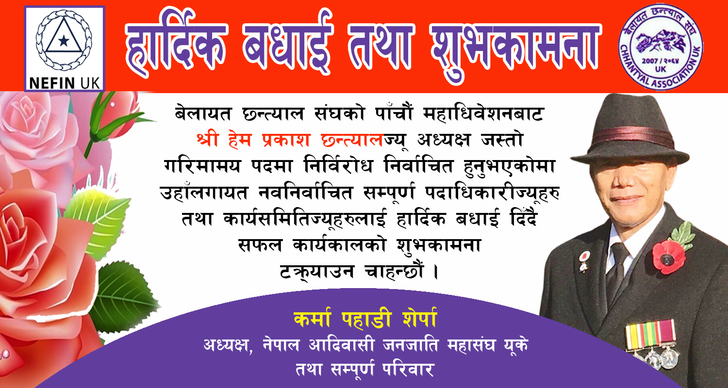 बेलायत छन्त्याल संघको पाँचौं महाधिवेशनबाट श्री हेम प्रकाश छन्त्यालज्यु अध्यक्ष जस्तो गरिमामय पदमा निर्बिरोध निर्वाचित हुनुभएकोमा उहाँ लगायत सम्पूर्ण नबनिर्वाचित पदाधिकारीज्युहरु तथा कार्यसमितिज्युहरुलाई हार्दिक बधाई दिदै सफल कार्यकालको शुभकामना टक्र्याउन चाहन्छौं।