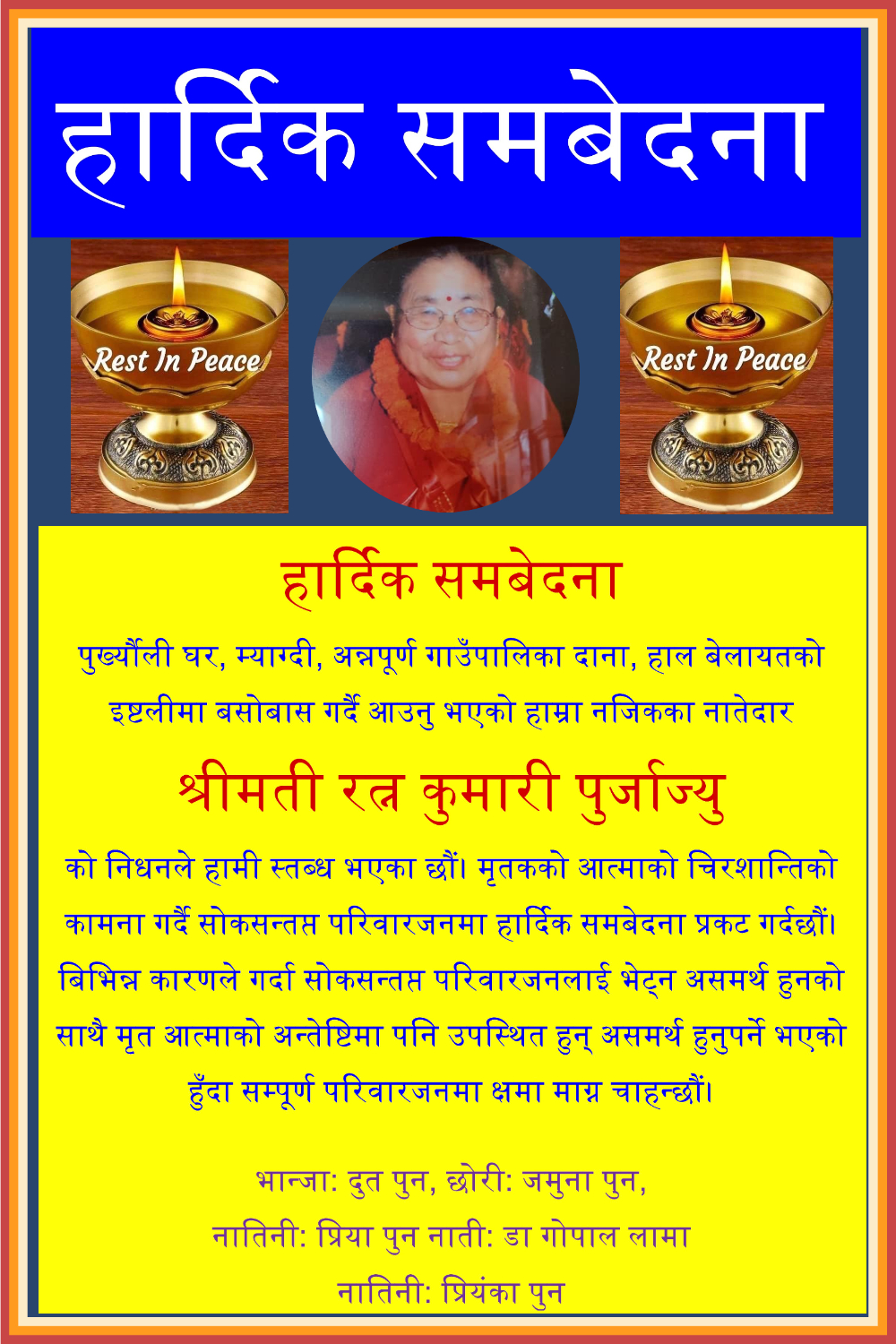 पुर्ख्यौली घर, म्याग्दी, अन्नपूर्ण गाउँपालिका दाना, हाल बेलायतको इष्टलीमा बसोबास गर्दै आउनु भएको हाम्रा नजिकका नातेदार श्रीमती रत्न कुमारी पुर्जाज्युको निधनले हामी स्तब्ध भएका छौं। मृतकको आत्माको चिरशान्तिको कामना गर्दै सोकसन्तप्त परिवारजनमा हार्दिक समबेदना प्रकट गर्दछौं। बिभिन्न कारणले गर्दा सोकसन्तप्त परिवारजनलाई भेट्न असमर्थ हुनको साथै मृत आत्माको अन्तेष्टिमा पनि उपस्थित हुन् असमर्थ हुनुपर्ने भएको हुँदा सम्पूर्ण परिवारजनमा क्षमा माग्न चाहन्छौं।