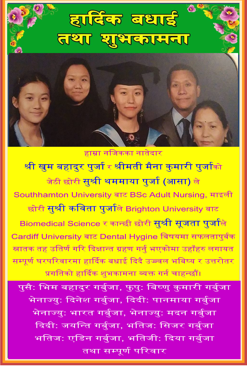 हाम्रा नजिकका नातेदार श्री खुम बहादुर पुर्जा र श्रीमती मैना कुमारी पुर्जाको जेठी छोरी सुश्री थममाया पुर्जा (आसा) ले Southhamton University बाट BSc Adult Nursing, माइली छोरी सुश्री कविता पुर्जाले Brighton University बाट Biomedical Science र कान्छी छोरी सुश्री सूजता पुर्जाले Cardiff University बाट Dental Hygine बिषयमा सफलतापुर्बक स्नातक तह उतिर्ण गरि दिक्षान्त ग्रहण गर्नु भएकोमा उहाँहरु लगायत सम्पूर्ण घरपरिवारमा हार्दिक बधाई दिदै उज्ज्वल भबिष्य र उत्तरोतर प्रगतिको हार्दिक शुभकामना व्यक्त गर्न चाहन्छौं।