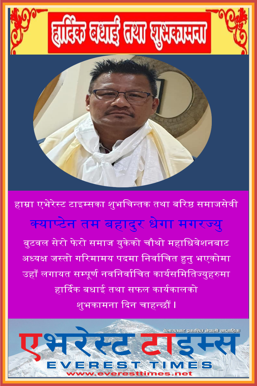 हाम्रा एभेरेस्ट टाइम्सका शुभचिन्तक तथा बरिष्ठ समाजसेवी क्याप्टेन तम बहादुर धेगा मगरज्यु बुटवल सेरो फेरो समाज युकेको चौथो महाधिवेशनबाट अध्यक्ष जस्तो गरिमामय पदमा निर्वाचित हुनु भएकोमा उहाँ लगायत सम्पूर्ण नवनिर्वाचित कार्यसमितिज्युहरुमा हार्दिक बधाई तथा सफल कार्यकालको शुभकामना दिन चाहन्छौं l