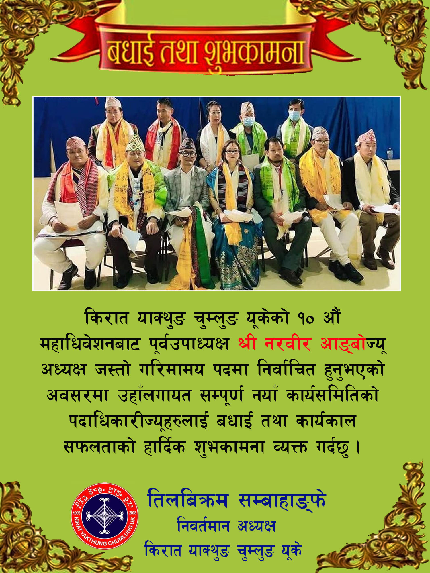 किरात याक्थुङ चुम्लुङ युकेको १० औं महाधिशेनबाट पुर्बउपाध्यक्ष श्री नरबिर आङबोज्यु अध्यक्ष जस्तो गरिमामय पदमा निर्वाचित हुनुभएकोमा उहाँलगायत सम्पूर्ण नवनिर्वाचित कार्यसमितिज्युहरुलाई हार्दिक बधाई तथा सफल कार्यकालको शुभकामना ब्याक्त गर्दछु
