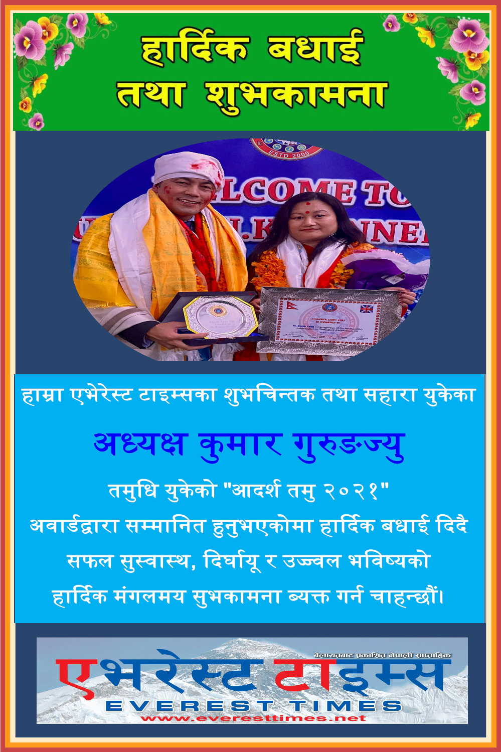 हाम्रा एभेरेस्ट टाइम्सका शुभचिन्तक तथा सहारा युकेका अध्यक्षकुमार गुरुङज्यु तमुधि युकेको “आदर्श तमु २०२१” अवार्डद्वारा सम्मानित हुनुभएकोमा हार्दिक बधाई दिदै सफल सुस्वास्थ, दिर्घायू र उज्ज्वल भविष्यको हार्दिक मंगलमय सुभकामना ब्यक्त गर्न चाहन्छौं।