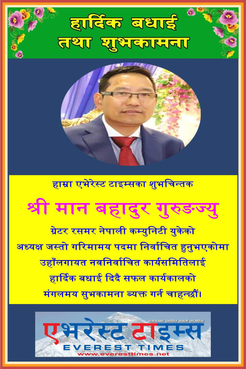 हाम्रा एभेरेस्ट टाइम्सका शुभचिन्तक श्री मान बहादुर गुरुङज्यु ग्रेटर रसमर नेपाली कम्युनिटी युकेको अध्यक्ष जस्तो गरिमामय पदमा निर्वाचित हुनुभएकोमा उहाँलगायत नवनिर्वाचित कार्यसमितिलाई हार्दिक बधाई दिदै सफल कार्यकालको मंगलमय सुभकामना ब्यक्त गर्न चाहन्छौं।