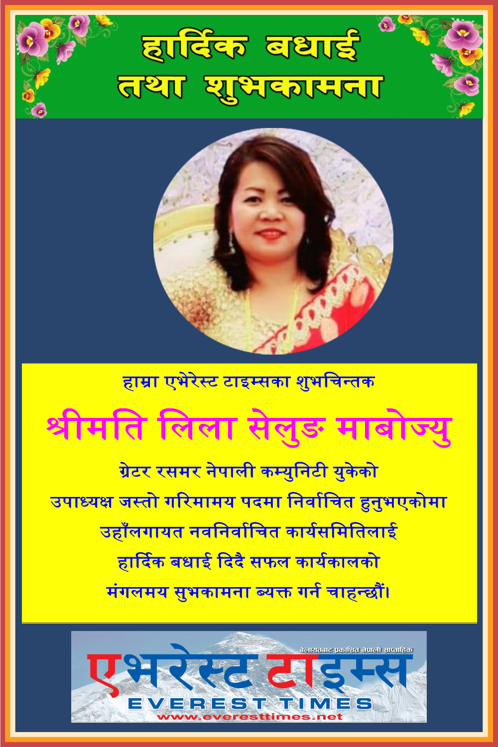 हाम्रा एभेरेस्ट टाइम्सका शुभचिन्तक श्रीमति लिला सेलुङ माबोज्यु ग्रेटर रसमर नेपाली कम्युनिटी युकेको उपाध्यक्ष जस्तो गरिमामय पदमा निर्वाचित हुनुभएकोमा हार्दिक बधाई दिदै सफल कार्यकालको मंगलमय सुभकामना ब्यक्त गर्न चाहन्छौं।
