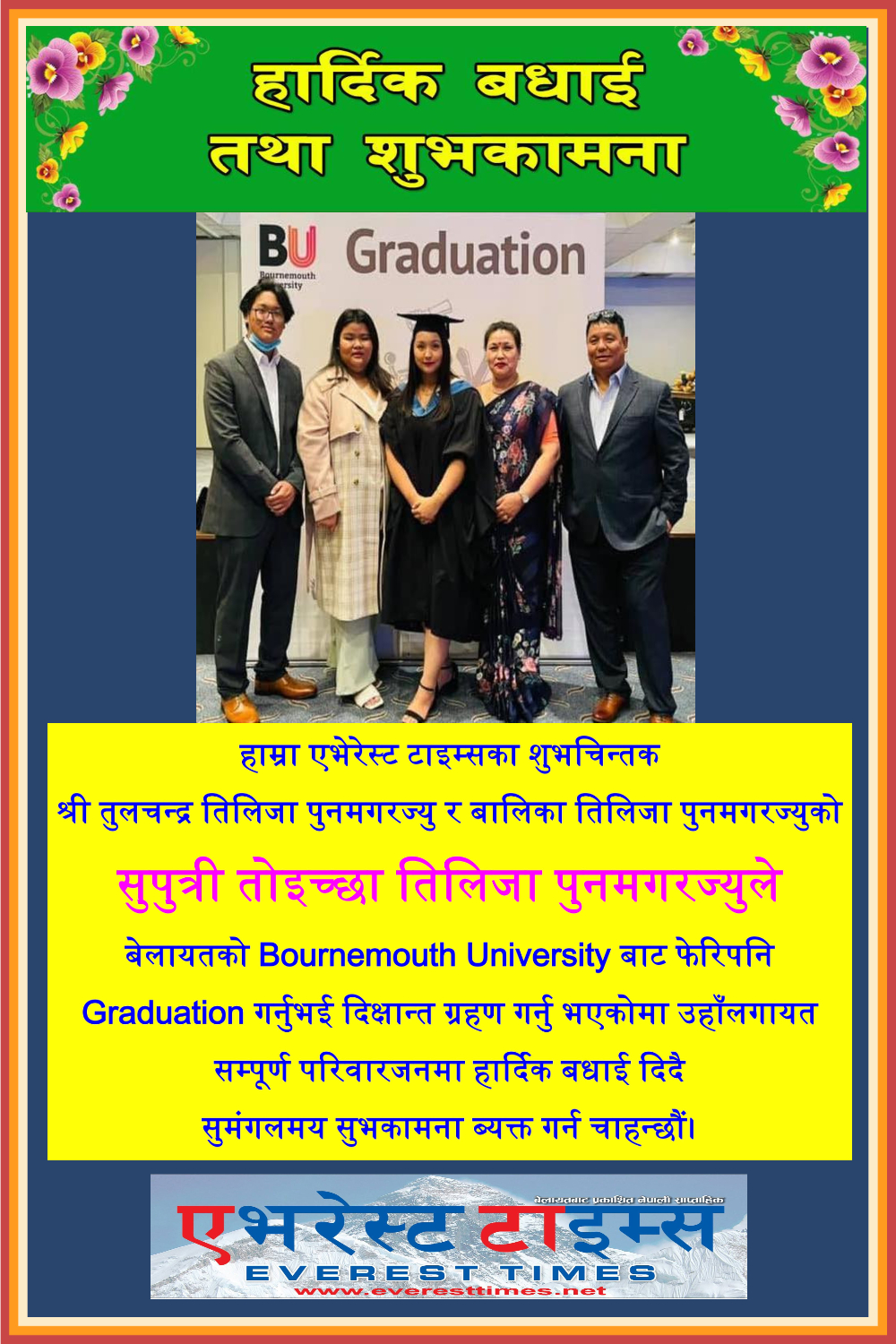 हाम्रा एभेरेस्ट टाइम्सका शुभचिन्तक श्री तुलचन्द्र तिलिजा पुनमगरज्यु र बालिका तिलिजा पुनमगरज्युको सुपुत्री तोइच्छा तिलिजा पुनमगरज्युले बेलायतको Bournemouth University बाट फेरिपनि Graduation गर्नुभई दिक्षान्त ग्रहण गर्नु भएकोमा उहाँलगायत सम्पूर्ण परिवारजनमा हार्दिक बधाई दिदै सुमंगलमय सुभकामना ब्यक्त गर्न चाहन्छौं।