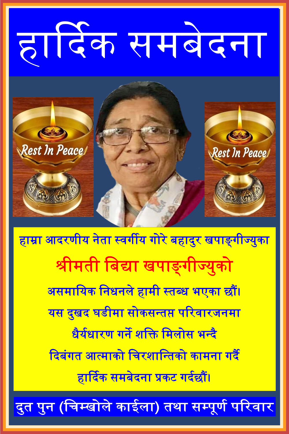 हाम्रा आदरणीय नेता स्वर्गीय गोरे बहादुर खपाङ्गीज्युका श्रीमती बिद्या खपाङ्गीज्युको असमायिक निधनले हामी स्तब्ध भएका छौं। यस दुखद घडीमा सोकसन्तप्त परिवारजनमा धैर्यधारण गर्ने शक्ति मिलोस भन्दै दिबंगत आत्माको चिरशान्तिको कामना गर्दै हार्दिक समबेदना प्रकट गर्दछौं।