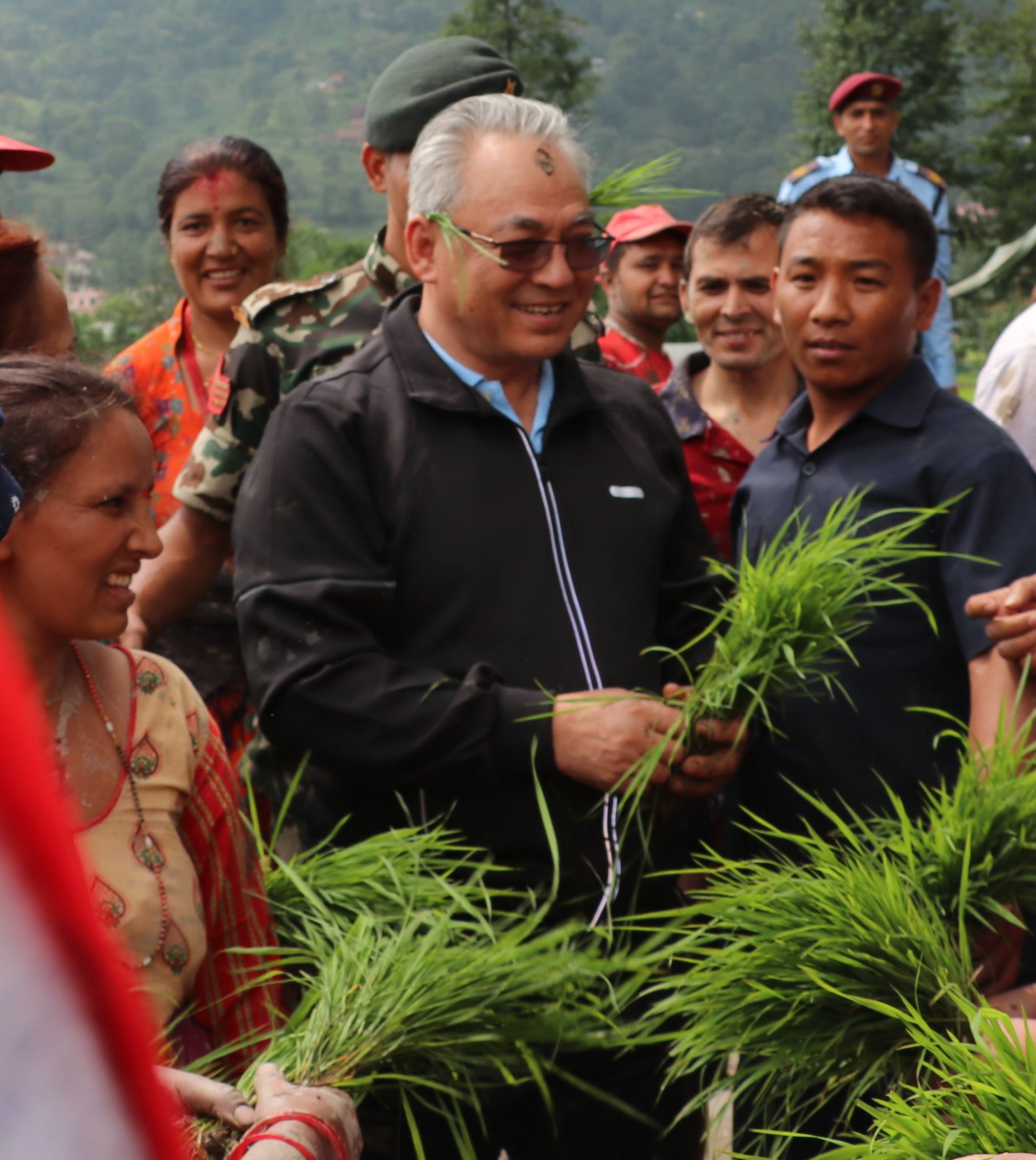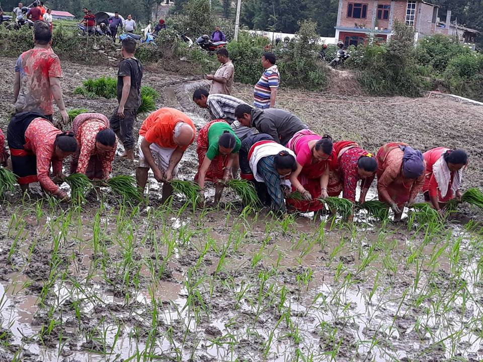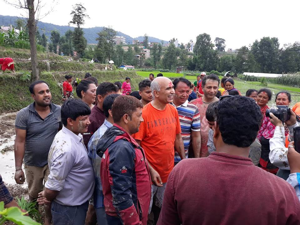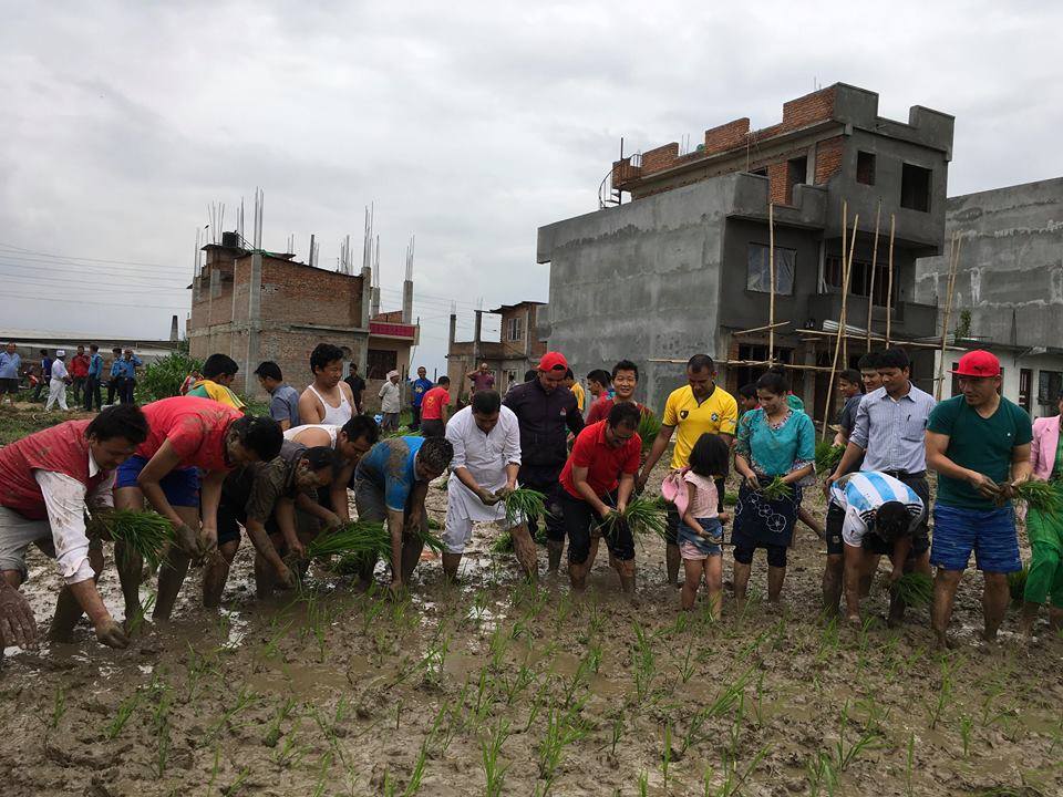 ललितपुरको हरिसिद्धिमा रोपाइ मा सहभागी हुँदै नेकपाका नेताहरु नारायणकाजी श्रेष्ठ, मणि थापा, युबा संघ नेपालका महासचिव नरेस शाही, वाईसीएल नेपालका सचिब पूर्ण भुजेल (चिन्तन) लगायतका युबा, किसानहरु ।