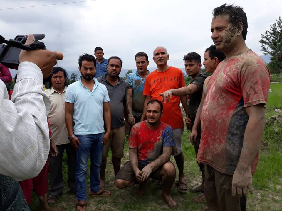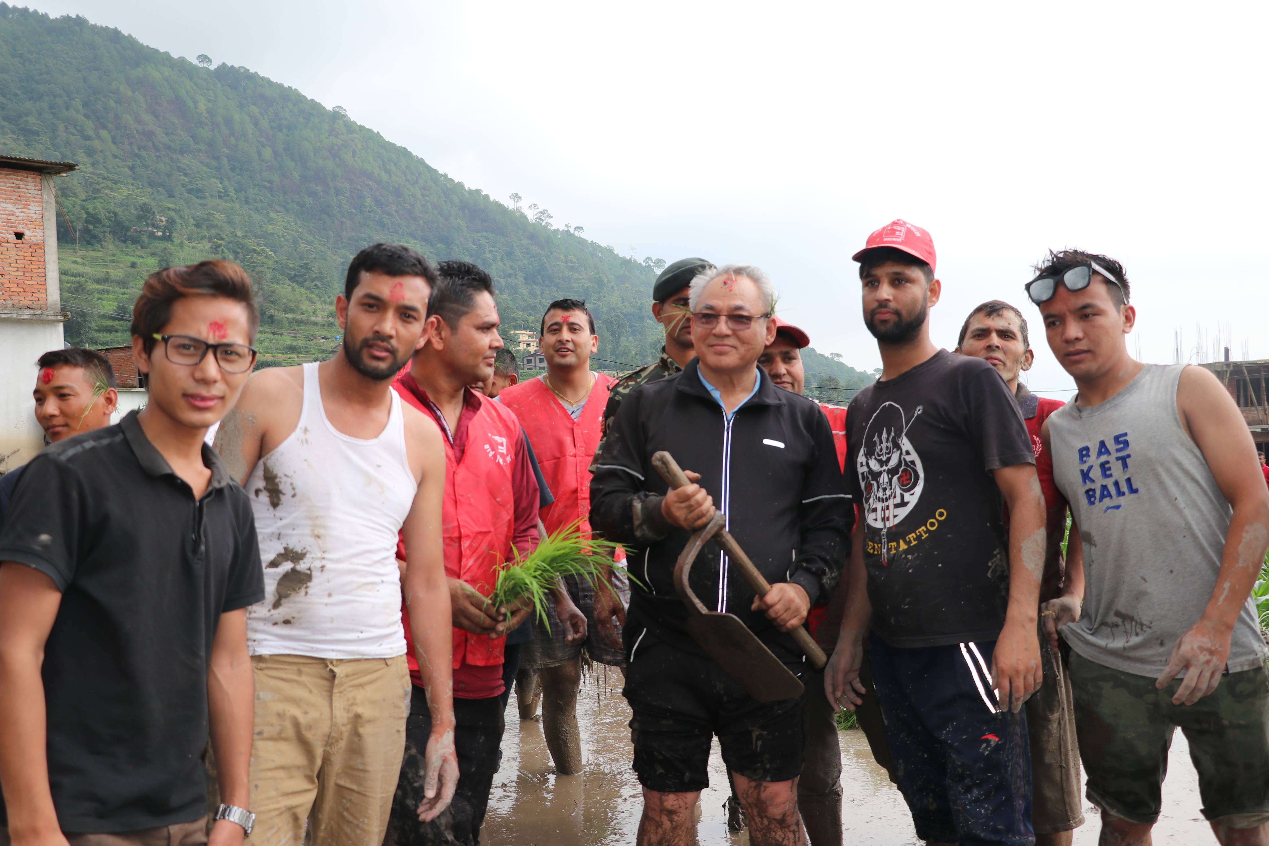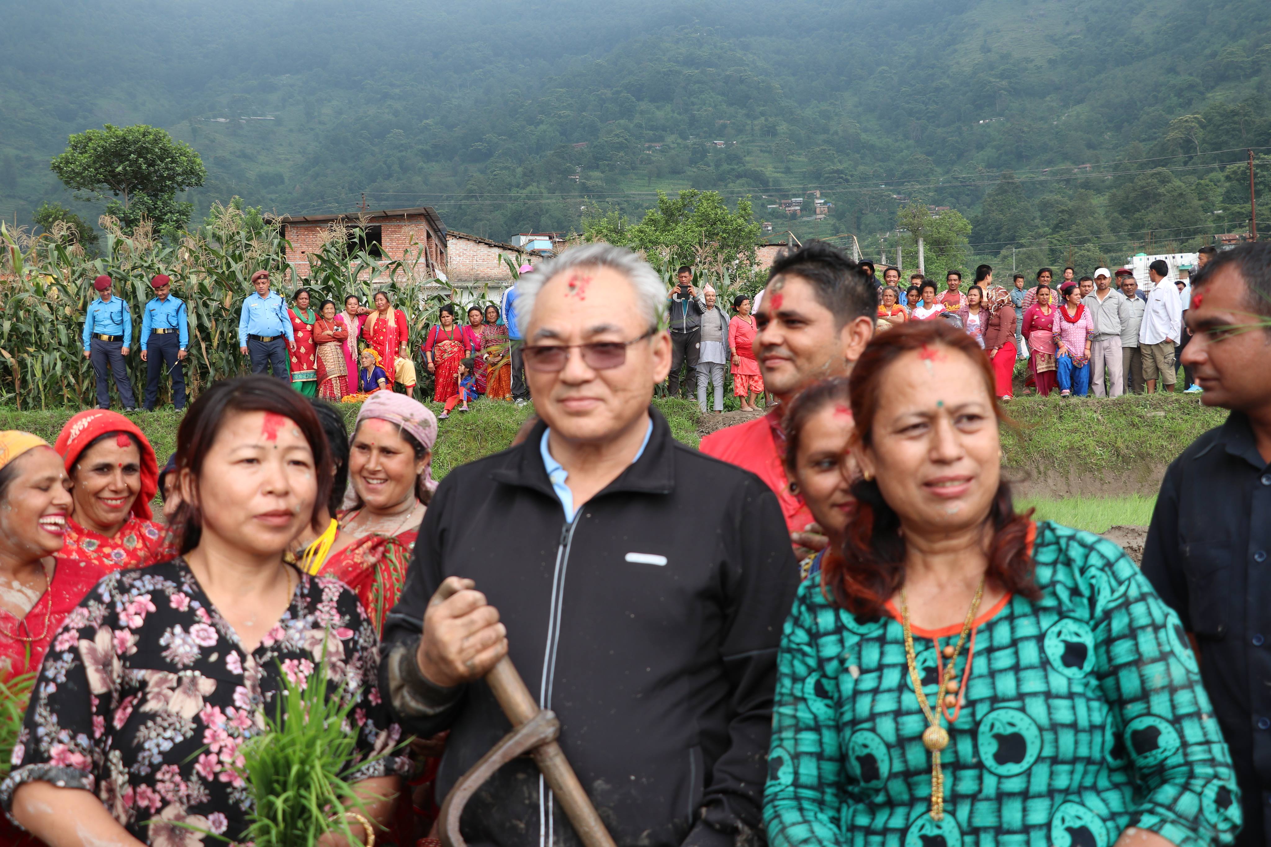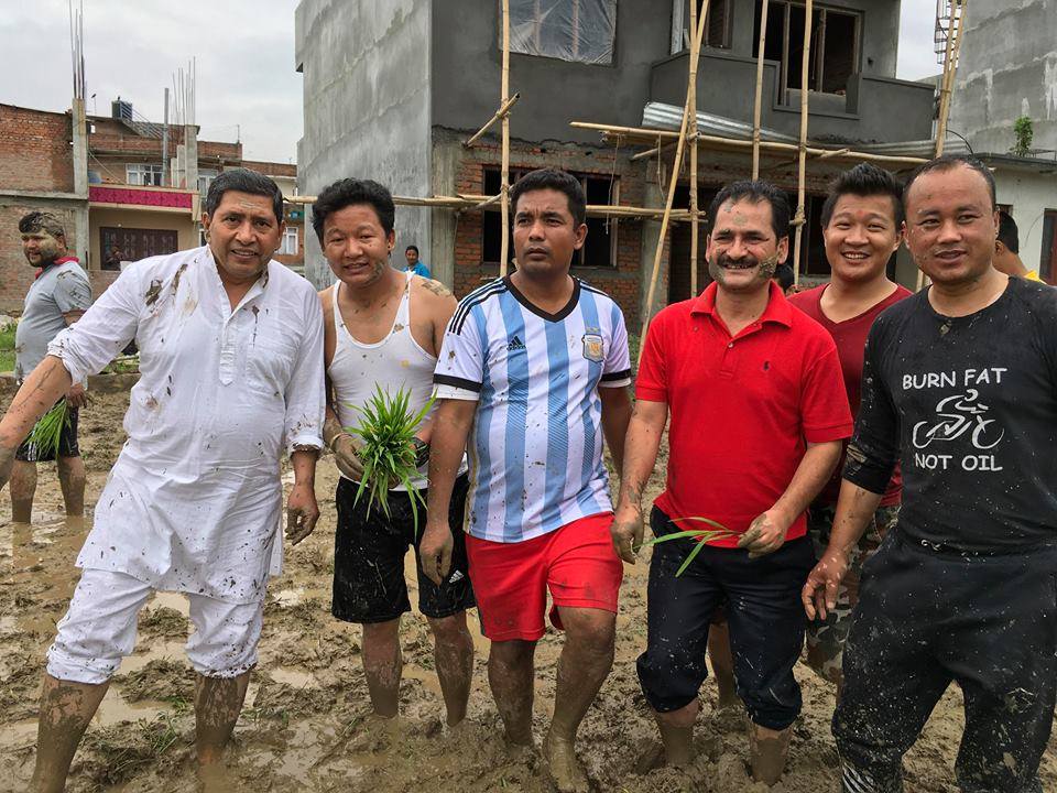 ललितपुरको हरिसिद्धिमा रोपाइ मा सहभागी हुँदै नेकपाका नेताहरु नारायणकाजी श्रेष्ठ, मणि थापा, युबा संघ नेपालका महासचिव नरेस शाही, वाईसीएल नेपालका सचिब पूर्ण भुजेल (चिन्तन) लगायतका युबा, किसानहरु ।