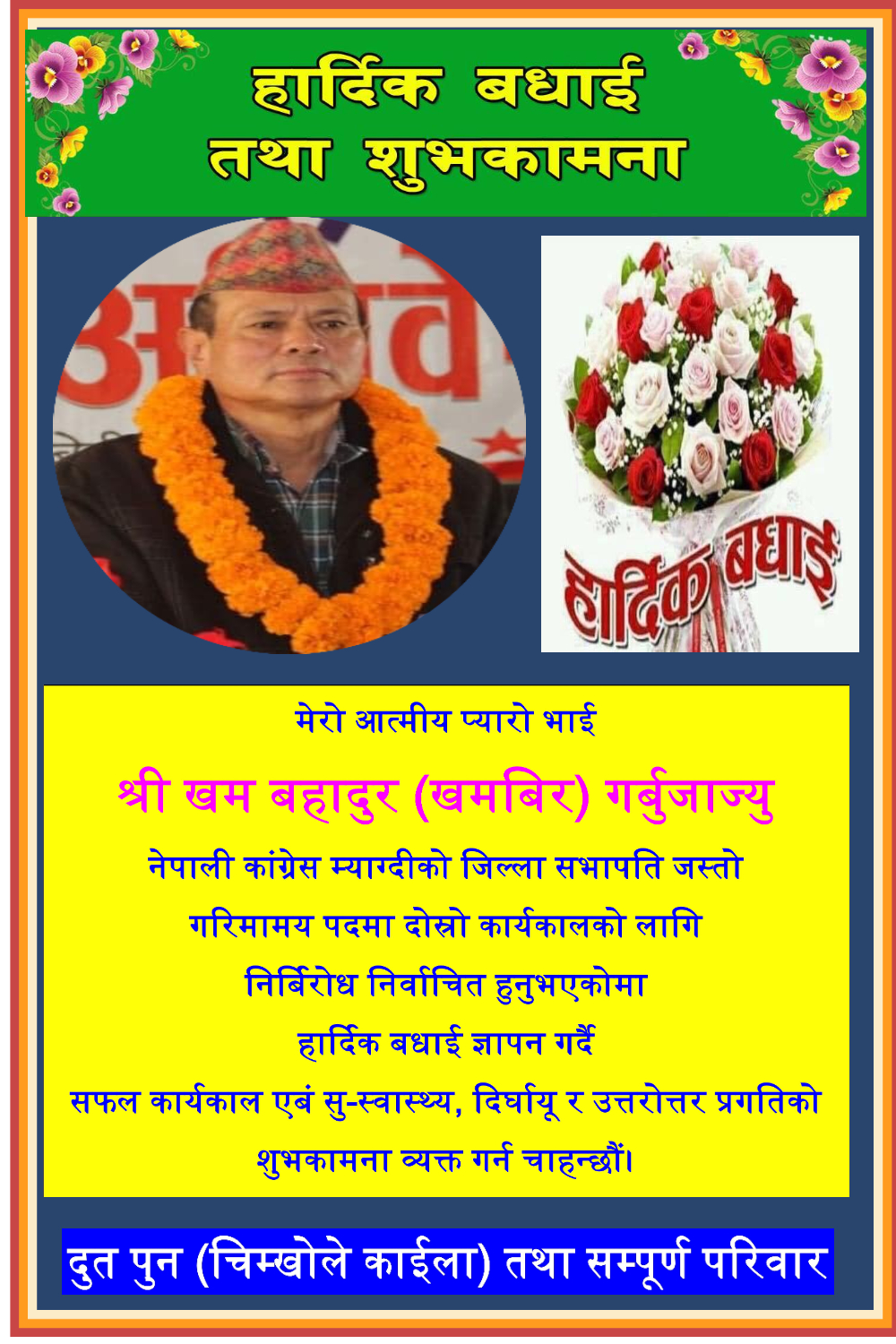 मेरो आत्मीय प्यारो भाई श्री खम बहादुर (खमबिर) गर्बुजाज्यु नेपाली कांग्रेस म्याग्दीको जिल्ला सभापति जस्तो गरिमामय पदमा दोस्रो कार्यकालको लागि निर्बिरोध निर्वाचित हुनुभएकोमा हार्दिक बधाई ज्ञापन गर्दै सफल कार्यकाल एबं सु-स्वास्थ्य, दिर्घायू र उत्तरोत्तर प्रगतिको शुभकामना व्यक्त गर्न चाहन्छौं।