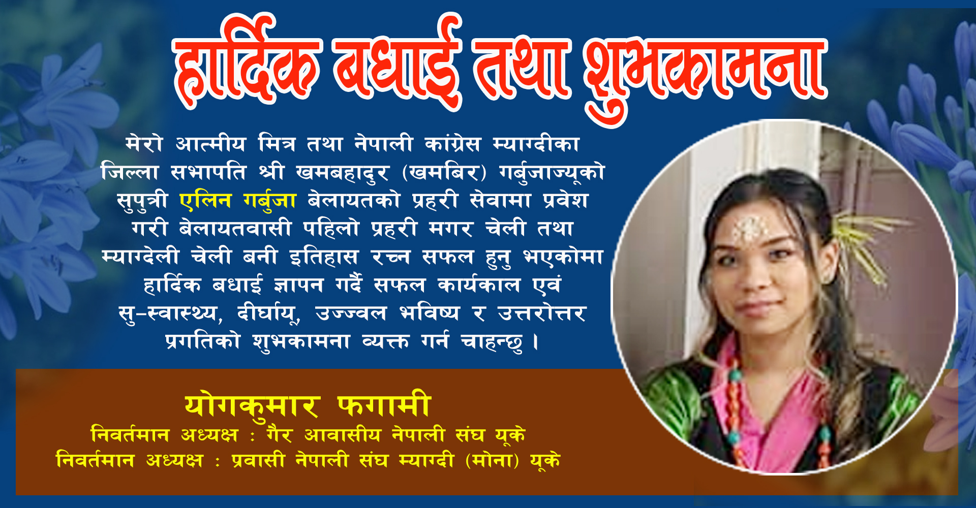 मेरो आत्मीय मित्र तथा नेपाली कांग्रेस म्याग्दीका जिल्ला सभापति श्री खम बहादुर (खमबिर) गर्बुजाज्युको सुपत्री एलिन गर्बुजा बेलायतको प्रहरी सेवामा प्रवेश गरि बेलायतबासी पहिलो प्रहरी मगर चेली तथा म्याग्देली चेली बनि इतिहाँस रच्न सफल हुनुभएकिमा हार्दिक बधाई ज्ञापन गर्दै सफल कार्यकाल एबं सु-स्वास्थ्य, दिर्घायू, उज्जवल भविश्य र उत्तरोत्तर प्रगतिको शुभकामना व्यक्त गर्न चाहन्छौं।