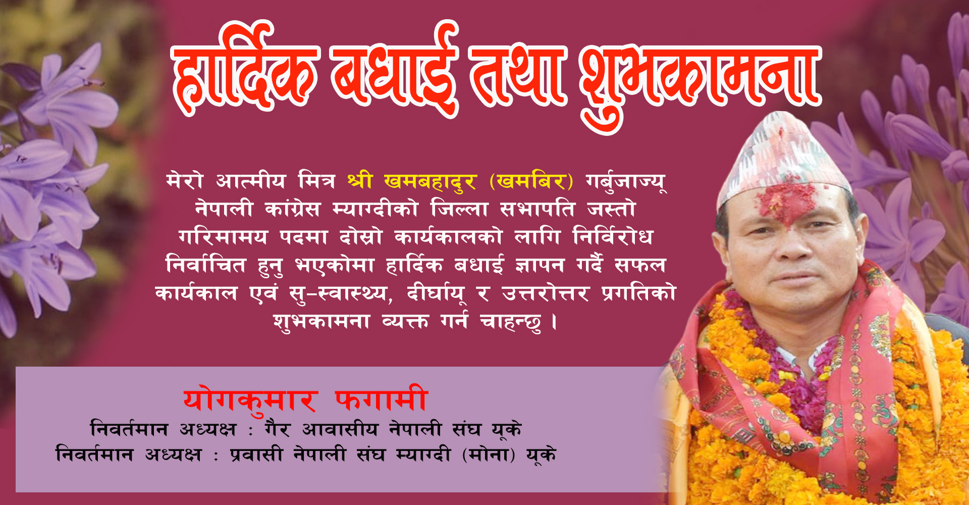 मेरो आत्मीय मित्र श्री खम बहादुर (खमबिर) गर्बुजाज्यु नेपाली कांग्रेस म्याग्दीको जिल्ला सभापति जस्तो गरिमामय पदमा दोस्रो कार्यकालको लागि निर्बिरोध निर्वाचित हुनुभएकोमा हार्दिक बधाई ज्ञापन गर्दै सफल कार्यकाल एबं सु-स्वास्थ्य, दिर्घायू र उत्तरोत्तर प्रगतिको शुभकामना व्यक्त गर्न चाहन्छौं।