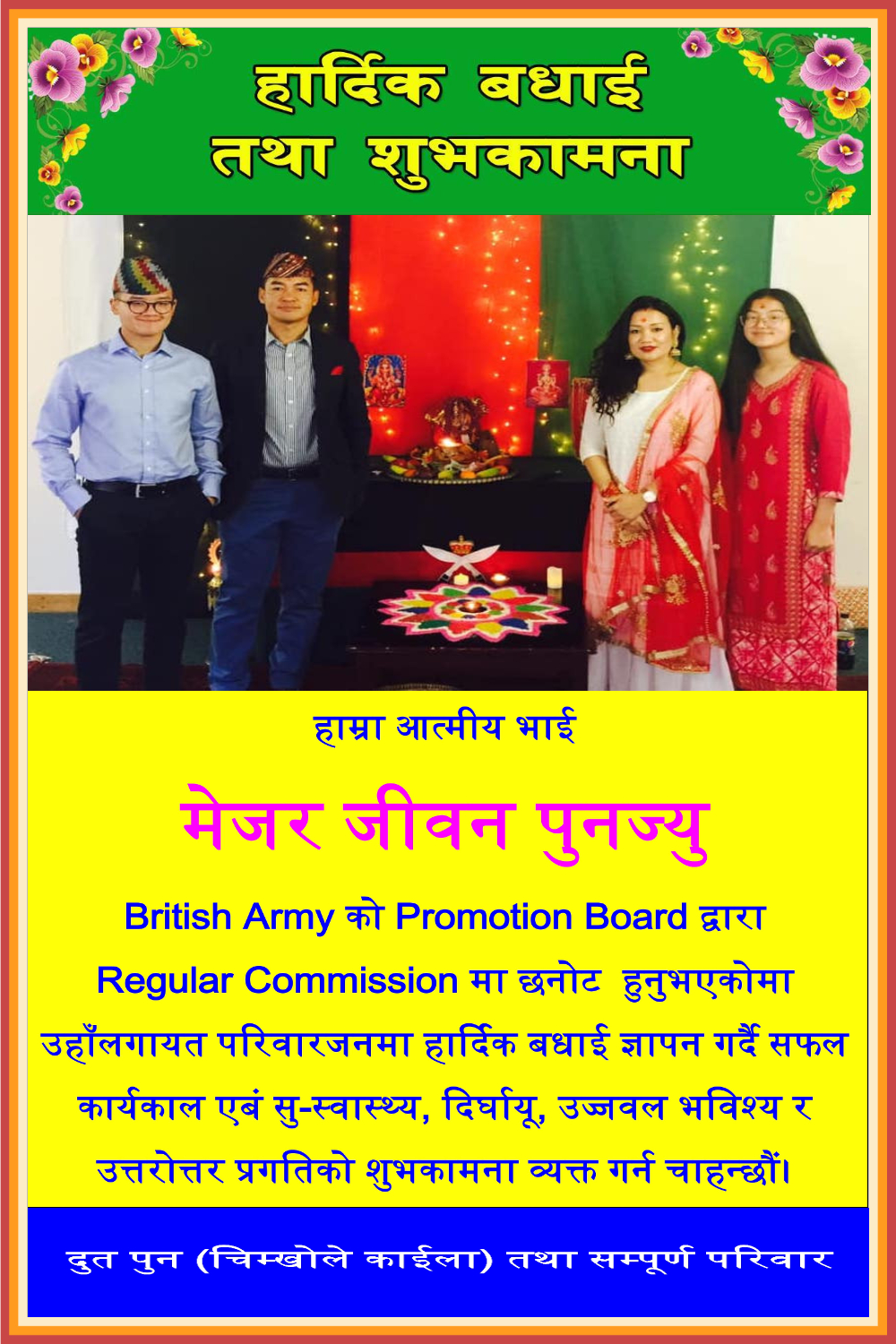 हाम्रा आत्मीय भाई मेजर जीवन पुनज्यु British Army को Promotion Board द्वारा Regular Commission मा छनोट हुनुभएकोमा उहाँलगायत परिवारजनमा हार्दिक बधाई ज्ञापन गर्दै सफल कार्यकाल एबं सु-स्वास्थ्य, दिर्घायू, उज्जवल भविश्य र उत्तरोत्तर प्रगतिको शुभकामना व्यक्त गर्न चाहन्छौं।