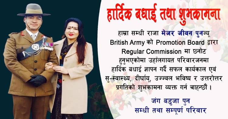 हाम्रा आत्मीय सम्धी राजा मेजर जीवन पुनज्यु British Army को Promotion Board द्वारा Regular Commission मा छनोट हुनुभएकोमा उहाँलगायत परिवारजनमा हार्दिक बधाई ज्ञापन गर्दै सफल कार्यकाल एबं सु-स्वास्थ्य, दिर्घायू, उज्जवल भविश्य र उत्तरोत्तर प्रगतिको शुभकामना व्यक्त गर्न चाहन्छौं।