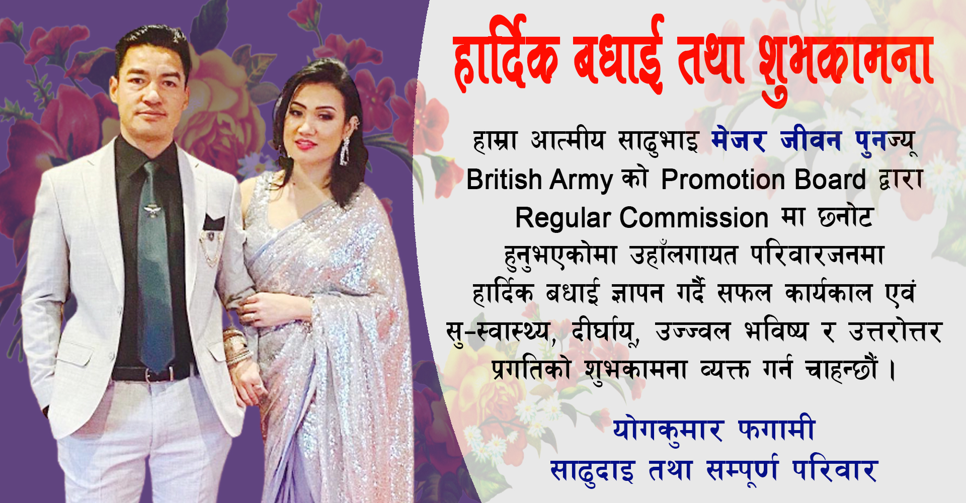 मेरो आत्मीय साधुभाई मेजर जीवन पुनज्यु British Army को Promotion Board द्वारा Regular Commission मा छनोट हुनुभएकोमा उहाँका परिवारजनमा हार्दिक बधाई ज्ञापन गर्दै सफल कार्यकाल एबं सु-स्वास्थ्य, दिर्घायू, उज्जवल भविश्य र उत्तरोत्तर प्रगतिको शुभकामना व्यक्त गर्न चाहन्छौं।