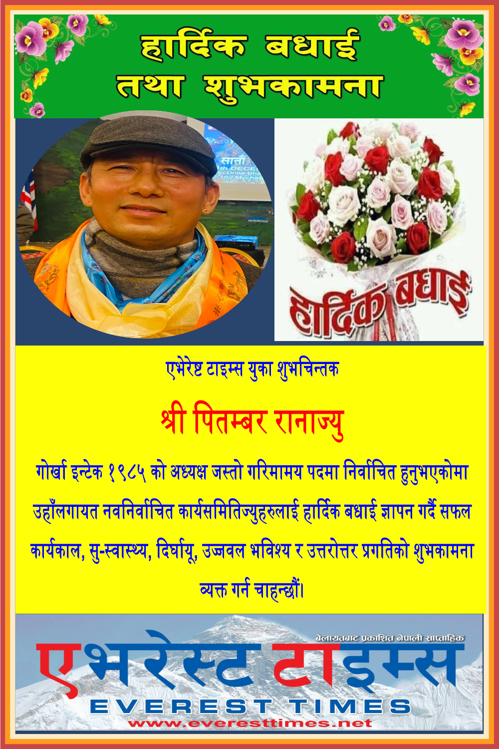 एभेरेष्ट टाइम्स युकेका शुभचिन्तक श्री पितम्बर रानाज्यु गोर्खा इन्टेक १९८५ को अध्यक्ष जस्तो गरिमामय पदमा निर्वाचित हुनुभएकोमा उहाँलगायत नवनिर्वाचित कार्यसमितिज्युहरुलाई हार्दिक बधाई ज्ञापन गर्दै सफल कार्यकाल, सु-स्वास्थ्य, दिर्घायू, उज्जवल भविश्य र उत्तरोत्तर प्रगतिको शुभकामना व्यक्त गर्न चाहन्छौं।