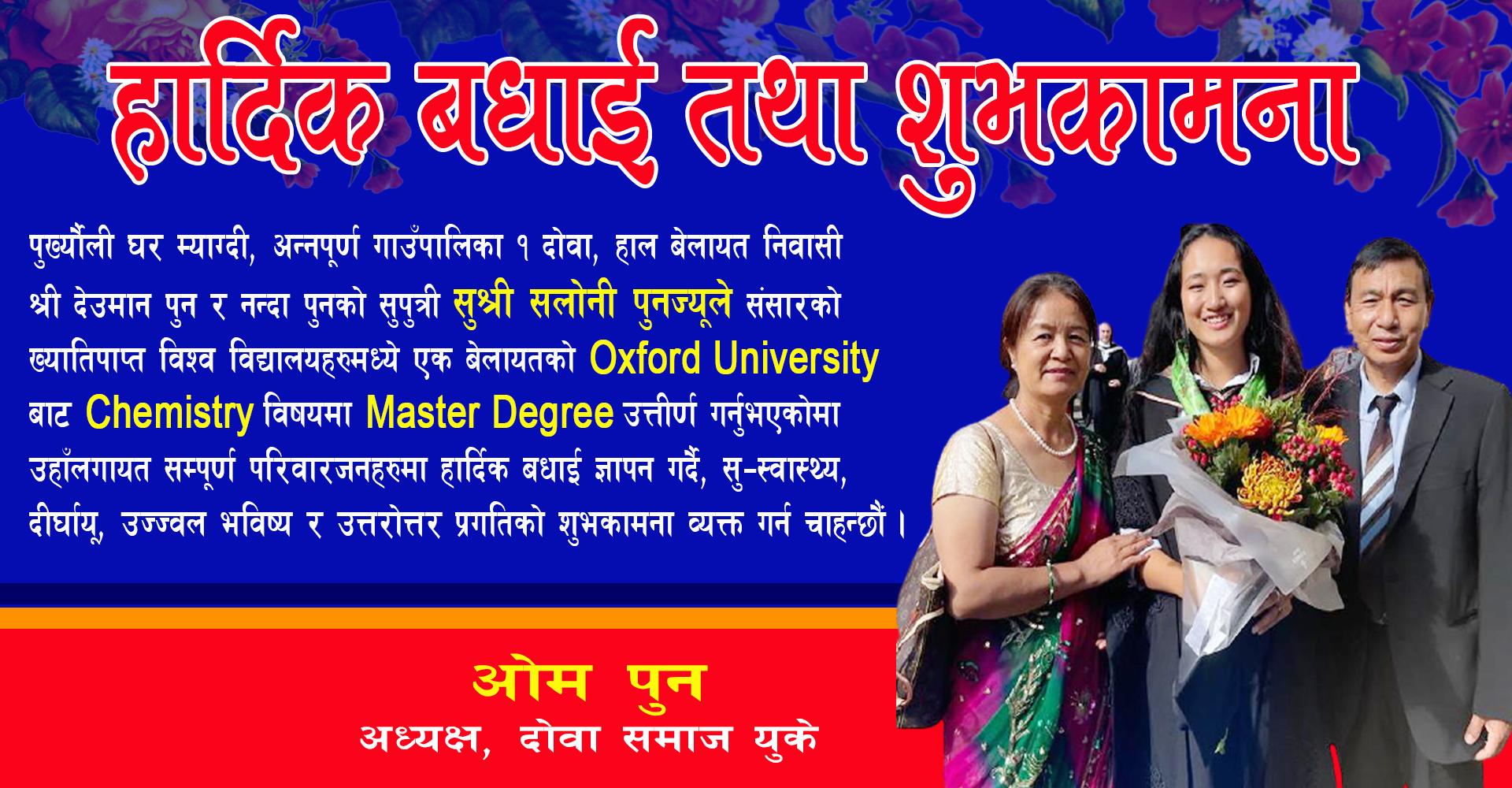 पुर्ख्यौली घर म्याग्दी, अन्नपूर्ण गाउँपालिका १ दोवा, हाल बेलायत निवासी श्री देउमान पुन र नन्दा पुनको सुपुत्री सुश्री सलोनी पुनले संसारको ख्यातिपाप्त बिश्वबिद्यालय मध्ये एक बेलायतको Oxford University बाट Chemistry बिषयमा Master Degree उतिर्ण गर्नुभएकोमा उहाँलगायत सम्पूर्ण परिवारजनहरुमा हार्दिक बधाई ज्ञापन गर्दै, सु-स्वास्थ्य, दिर्घायू, उज्जवल भविश्य र उत्तरोत्तर प्रगतिको शुभकामना व्यक्त गर्न चाहन्छौं।