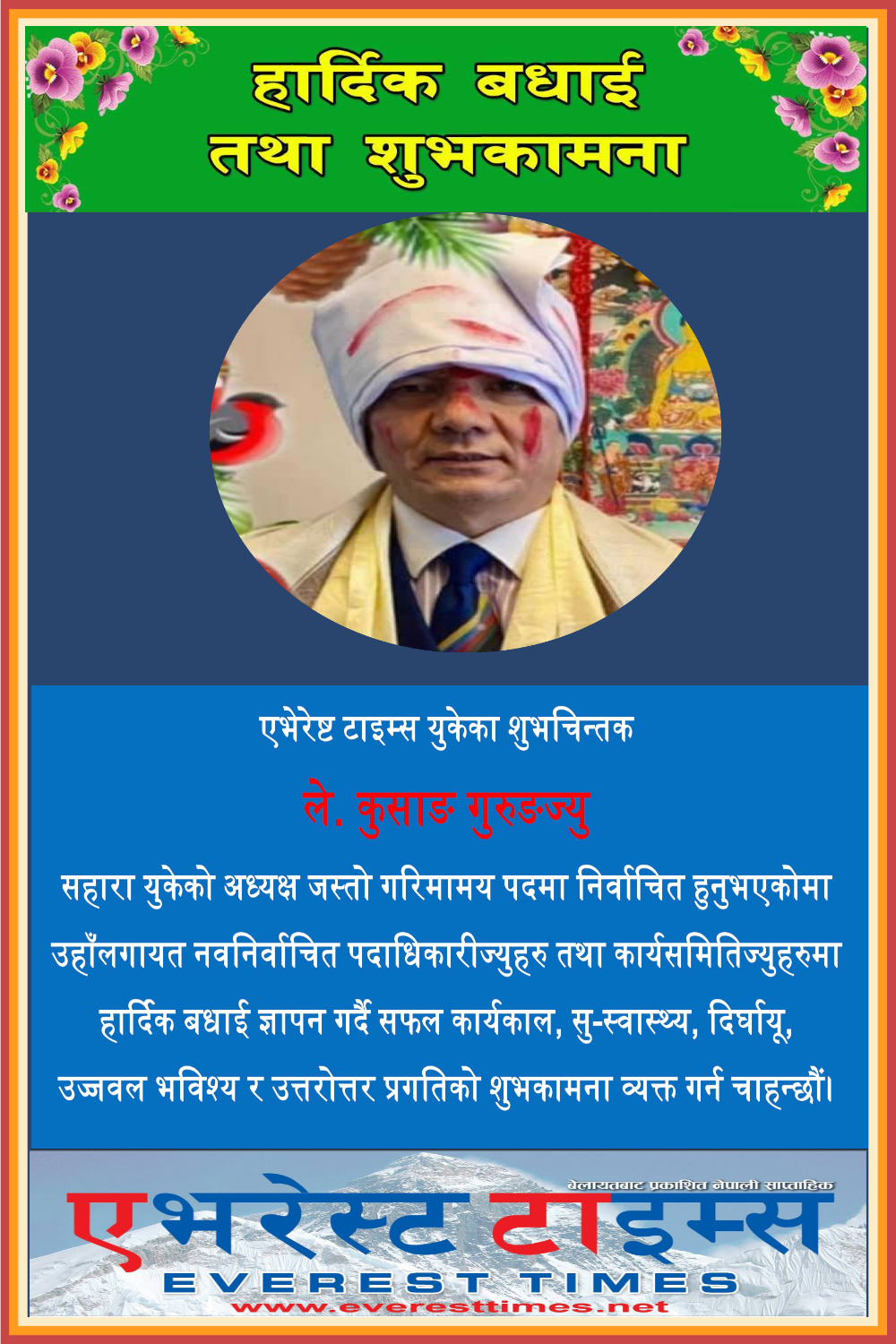 एभेरेष्ट टाइम्स युकेका शुभचिन्तक ले. कुसाङ गुरुङज्यु सहारा युकेको अध्यक्ष जस्तो गरिमामय पदमा निर्वाचित हुनुभएकोमा उहाँलगायत नवनिर्वाचित पदाधिकारीज्युहरु तथा कार्यसमितिज्युहरुमा हार्दिक बधाई ज्ञापन गर्दै सफल कार्यकाल, सु-स्वास्थ्य, दिर्घायू, उज्जवल भविश्य र उत्तरोत्तर प्रगतिको शुभकामना व्यक्त गर्न चाहन्छौं।