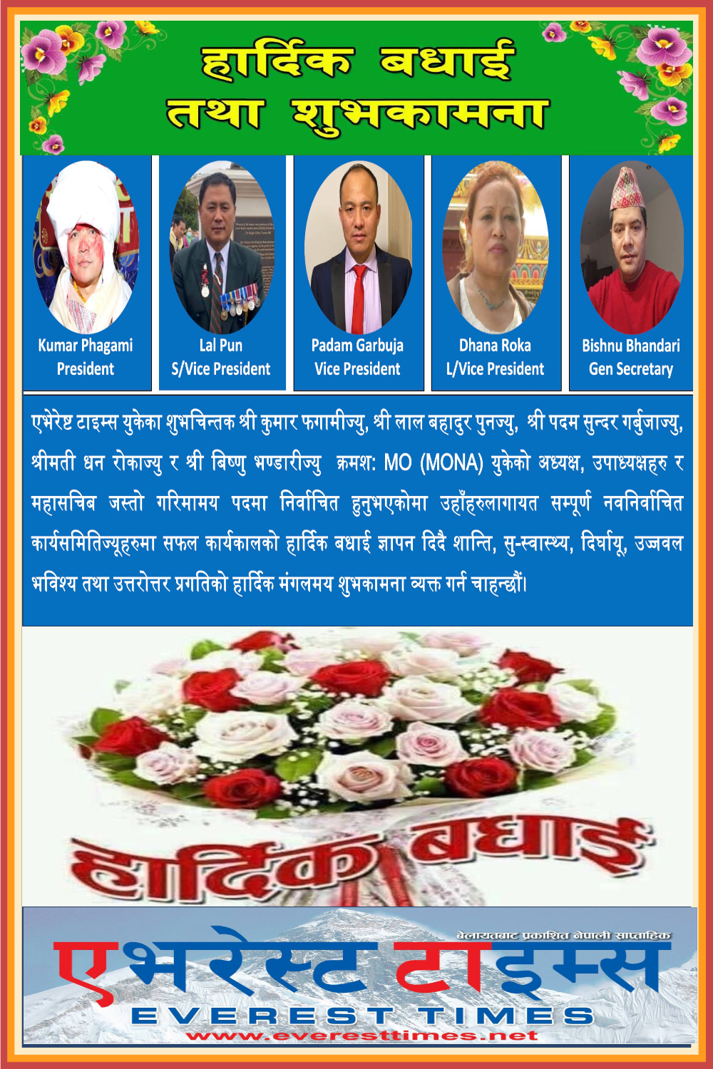एभेरेष्ट टाइम्स युकेका शुभचिन्तक श्री कुमार फगामीज्यु, श्री लाल बहादुर पुनज्यु, श्री पदम सुन्दर गर्बुजाज्यु, श्रीमती धन रोकाज्यु र श्री बिष्णु भण्डारीज्यु क्रमश: MO (MONA) युकेको अध्यक्ष, उपाध्यक्षहरु र महासचिब जस्तो गरिमामय पदमा निर्वाचित हुनुभएकोमा उहाँहरुलागायत सम्पूर्ण नवनिर्वाचित कार्यसमितिज्यूहरुमा सफल कार्यकालको हार्दिक बधाई ज्ञापन दिदै शान्ति, सु-स्वास्थ्य, दिर्घायू, उज्जवल भविश्य तथा उत्तरोत्तर प्रगतिको हार्दिक मंगलमय शुभकामना व्यक्त गर्न चाहन्छौं।