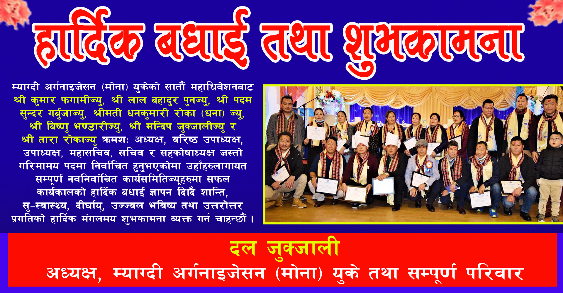 म्याग्दी अर्गनाइजेसन (मोना) युकेका माहाधिवेशनबाट श्री कुमार फगामीज्यु, श्री लाल बहादुर पुनज्यु, श्री पदम सुन्दर गर्बुजाज्यु, श्रीमती धन कुमारी रोका (धना) ज्यु र श्री बिष्णु भण्डारीज्यु, श्री मन्दिप जुक्जलीज्यु र श्री तारा रोकाज्यु क्रमश: अध्यक्ष, बरिष्ठ उपाध्यक्ष, उपाध्यक्ष, महासचिब, सचिब र सहकोषाध्यक्ष जस्तो गरिमामय पदमा निर्वाचित हुनुभएकोमा उहाँहरुलागायत सम्पूर्ण नवनिर्वाचित कार्यसमितिज्यूहरुमा सफल कार्यकालको हार्दिक बधाई ज्ञापन दिदै शान्ति, सु-स्वास्थ्य, दिर्घायू, उज्जवल भविश्य तथा उत्तरोत्तर प्रगतिको हार्दिक मंगलमय शुभकामना व्यक्त गर्न चाहन्छौं।