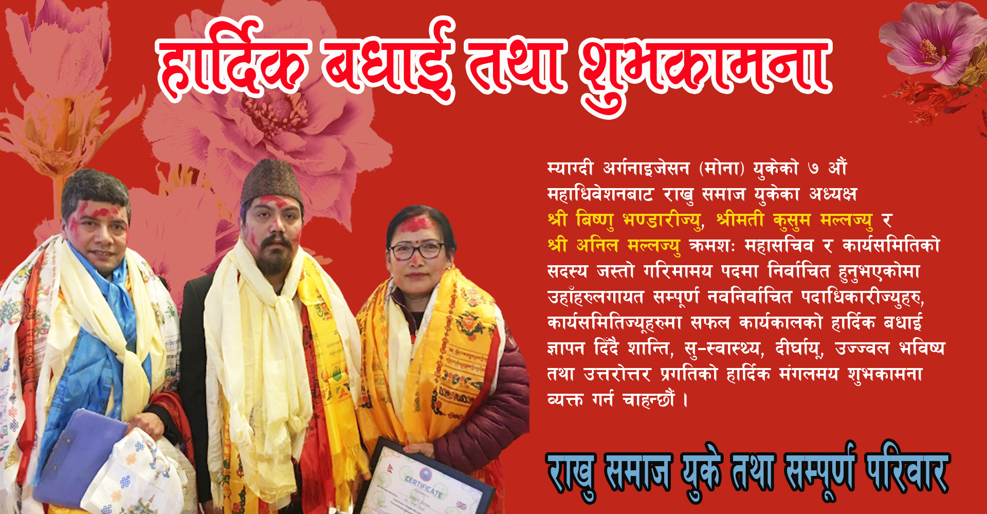 म्याग्दी अर्गनाइजेसन (मोना) युकेको ७ औं महाधिवेशनबाट राखु समाज युकेका अध्यक्ष श्री बिष्णु भण्डारीज्यु, श्रीमती कुसुम मल्लज्यु र श्री अनिल मल्लज्यु क्रमश: महासचिब र कार्यसमितिको सदस्य जस्तो गरिमामय पदमा निर्वाचित हुनुभएकोमा उहाँहरुलागायत सम्पूर्ण नवनिर्वाचित पदाधिकारीज्युहरु कार्यसमितिज्यूहरुमा सफल कार्यकालको हार्दिक बधाई ज्ञापन दिदै शान्ति, सु-स्वास्थ्य, दिर्घायू, उज्जवल भविश्य तथा उत्तरोत्तर प्रगतिको हार्दिक मंगलमय शुभकामना व्यक्त गर्न चाहन्छौं।