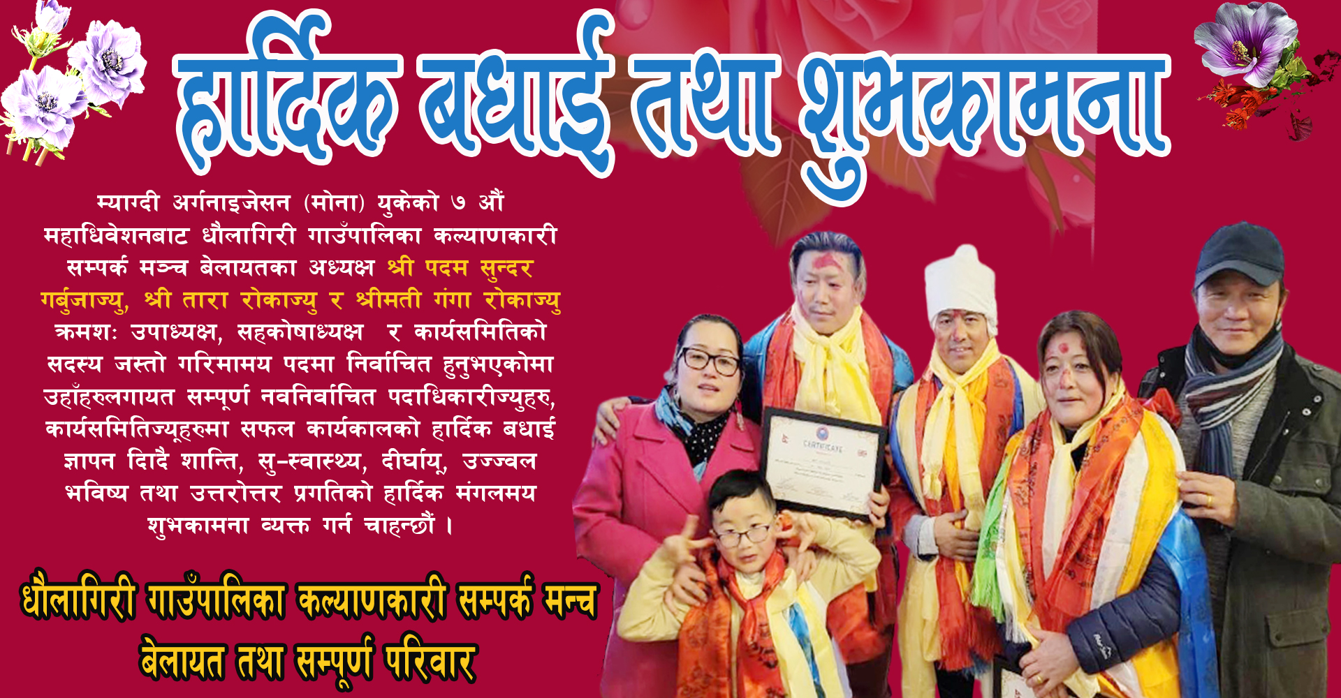 म्याग्दी अर्गनाइजेसन (मोना) युकेको ७ औं महाधिवेशनबाट धौलागिरी गाउपालिका कल्यानकारी संपर्क मन्च बेलायतका अध्यक्ष श्री पदम सुन्दर गर्बुजाज्यु, श्री तारा रोकाज्यु र श्रीमती गङ्गा रोकाज्यु क्रमश: उपाध्यक्ष, सहकोषाध्यक्ष र कार्यसमितिको सदस्य जस्तो गरिमामय पदमा निर्वाचित हुनुभएकोमा उहाँहरुलागायत सम्पूर्ण नवनिर्वाचित पदाधिकारीज्युहरु कार्यसमितिज्यूहरुमा सफल कार्यकालको हार्दिक बधाई ज्ञापन दिदै शान्ति, सु-स्वास्थ्य, दिर्घायू, उज्जवल भविश्य तथा उत्तरोत्तर प्रगतिको हार्दिक मंगलमय शुभकामना व्यक्त गर्न चाहन्छौं।