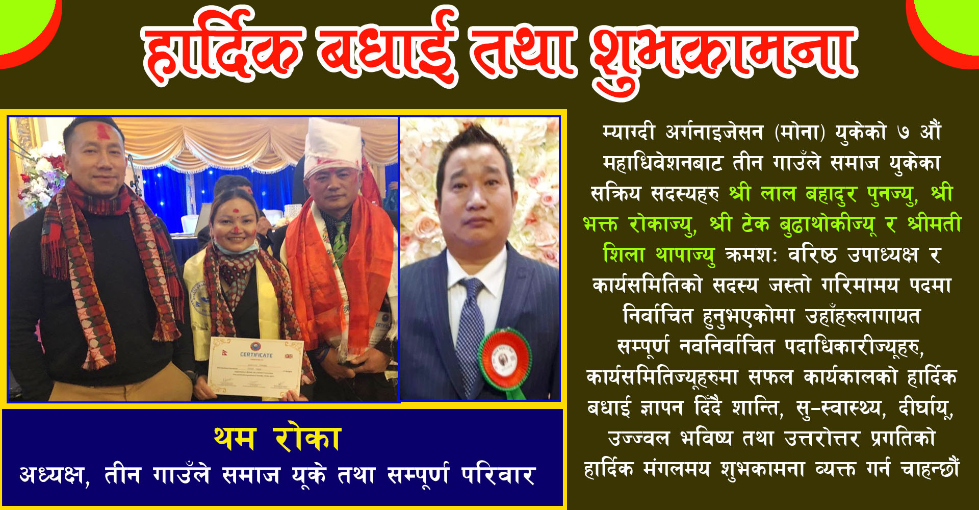 म्याग्दी अर्गनाइजेसन (मोना) युकेको ७ औं महाधिवेशनबाट तिन गाउॅले समाज युकेका सक्रिय सदस्यहरु श्री लाल बहादुर पुनज्यु, श्री भक्त रोकाज्यु , श्री टेक बुढाथोकिज्यु र श्रीमती शिला थापाज्यु क्रमश: बरिष्ठ उपाध्यक्ष र कार्यसमितिको सदस्य जस्तो गरिमामय पदमा निर्वाचित हुनुभएकोमा उहाँहरुलागायत सम्पूर्ण नवनिर्वाचित पदाधिकारीज्युहरु कार्यसमितिज्यूहरुमा सफल कार्यकालको हार्दिक बधाई ज्ञापन दिदै शान्ति, सु-स्वास्थ्य, दिर्घायू, उज्जवल भविश्य तथा उत्तरोत्तर प्रगतिको हार्दिक मंगलमय शुभकामना व्यक्त गर्न चाहन्छौं।