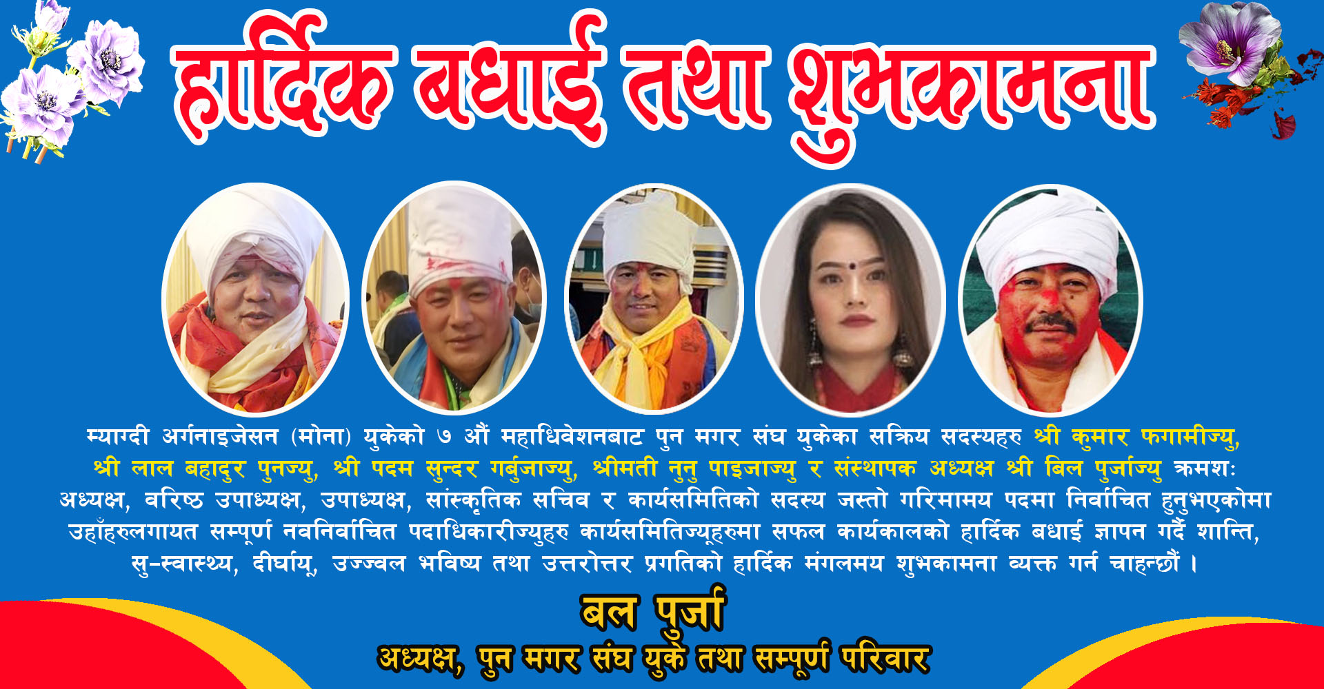 म्याग्दी अर्गनाइजेसन (मोना) युकेको ७ औं महाधिवेशनबाट पुन मगर संघ युकेका सक्रिय सदस्यहरु श्री कुमार फगामीज्यु, श्री लाल बहादुर पुनज्यु, श्री पदम सुन्दर गर्बुजाज्यु, श्रीमती नुनु पाइजाज्यु र संस्थापक अध्यक्ष श्री बिल पुर्जाज्यु क्रमश: अध्यक्ष, बरिष्ठ उपाध्यक्ष, उपाध्यक्ष, सांस्कृतिक सचिब र कार्यसमितिको सदस्य जस्तो गरिमामय पदमा निर्वाचित हुनुभएकोमा उहाँहरुलागायत सम्पूर्ण नवनिर्वाचित पदाधिकारीज्युहरु कार्यसमितिज्यूहरुमा सफल कार्यकालको हार्दिक बधाई ज्ञापन दिदै शान्ति, सु-स्वास्थ्य, दिर्घायू, उज्जवल भविश्य तथा उत्तरोत्तर प्रगतिको हार्दिक मंगलमय शुभकामना व्यक्त गर्न चाहन्छौं।