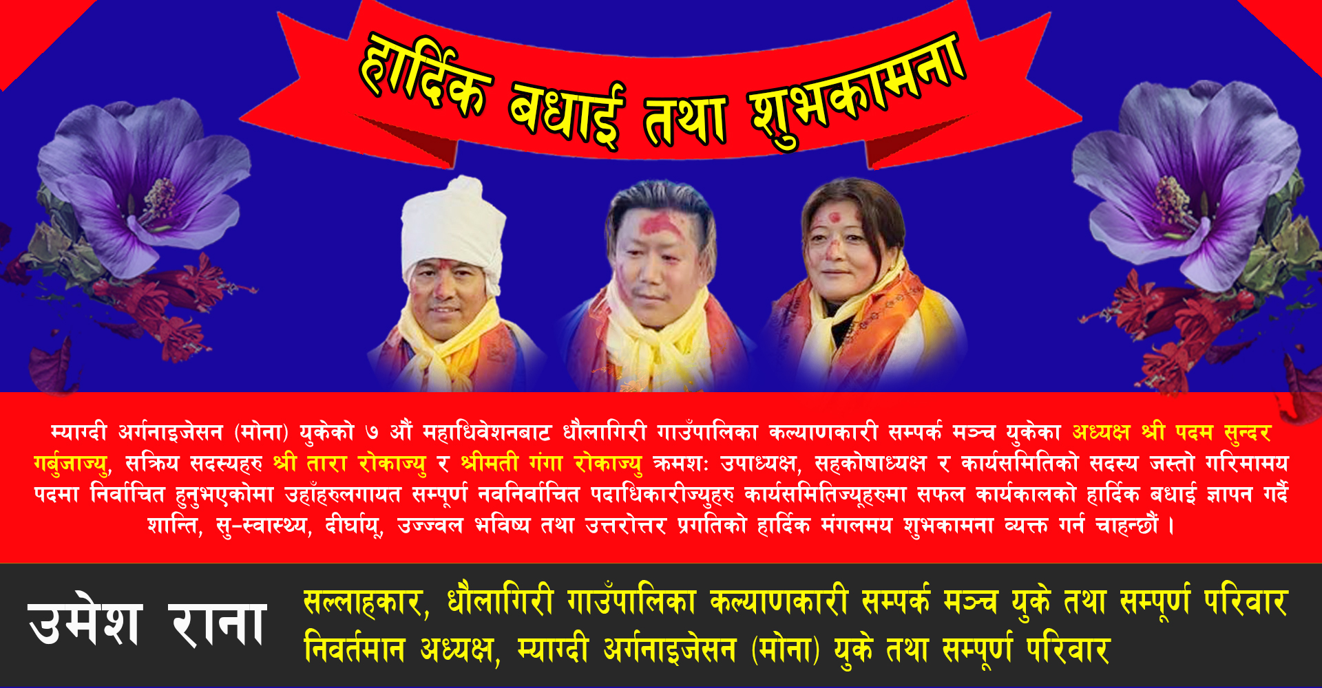 म्याग्दी अर्गनाइजेसन (मोना) युकेको ७ औं महाधिवेशनबाट धौलागिरी गाउँपालिका कल्याणकारी सम्पर्क मंच युकेका अध्यक्ष श्री पदम सुन्दर गर्बुजाज्यु, सक्रिय सदस्यहरु श्री तारा रोकाज्यु र श्रीमती गङ्गा रोकाज्यु क्रमश: उपाध्यक्ष, सहकोषाध्यक्ष र कार्यसमितिको सदस्य जस्तो गरिमामय पदमा निर्वाचित हुनुभएकोमा उहाँहरुलागायत सम्पूर्ण नवनिर्वाचित पदाधिकारीज्युहरु कार्यसमितिज्यूहरुमा सफल कार्यकालको हार्दिक बधाई ज्ञापन दिदै शान्ति, सु-स्वास्थ्य, दिर्घायू, उज्जवल भविश्य तथा उत्तरोत्तर प्रगतिको हार्दिक मंगलमय शुभकामना व्यक्त गर्न चाहन्छौं।