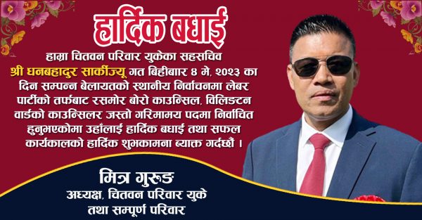 हाम्रा चितवन परिवार युकेका सह-सचिब श्री धन बहादुर सार्कीज्यु गत बिहिवार, ४ मे, २०२३ का दिन सम्पन्न बेलायतको स्थानीय निर्वाचनमा लेबर पार्टीको तर्फबाट रसमोरबोरो काउन्सिल, विलिङटन वार्डको काउन्सिलर जस्तो गरिमामय पदमा निर्वाचित हुनुभएकोमा उहाँलाई हार्दिक बधाई तथा सफल कार्यकालको हार्दिक शुभकामना ब्याक्त गर्दछौं।