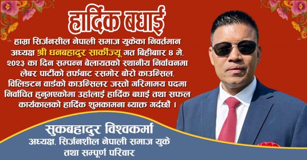 हाम्रा सृजनसिल नेपाली समाज युकेका निबर्तमान अध्यक्ष श्री धन बहादुर सार्कीज्यु गत बिहिवार, ४ मे, २०२३ का दिन सम्पन्न बेलायतको स्थानीय निर्वाचनमा लेबर पार्टीको तर्फबाट रसमोरबोरो काउन्सिल, विलिङ्ग टन वार्डको काउन्सिलर जस्तो गरिमामय पदमा निर्वाचित हुनुभएकोमा उहाँलाई हार्दिक बधाई तथा सफल कार्यकालको हार्दिक शुभकामना ब्याक्त गर्दछौं।