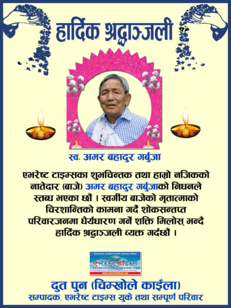 एभेरेष्ट टाईम्सका शुभचिन्तकहरु तथा हाम्रो नजिकको नातेदार (बाज्ये) अमर बहादुर गर्बुजाको निधनले स्तब्ध भएका छौं। स्वर्गीय बाज्येको मृतात्माको चिरशान्तिको कामना गर्दै सोकसन्तप्त परिवारजनमा धैर्यधारण गर्ने शक्ति मिलोस भन्दै हार्दिक श्रद्धान्जली व्यक्त गर्दछौं।