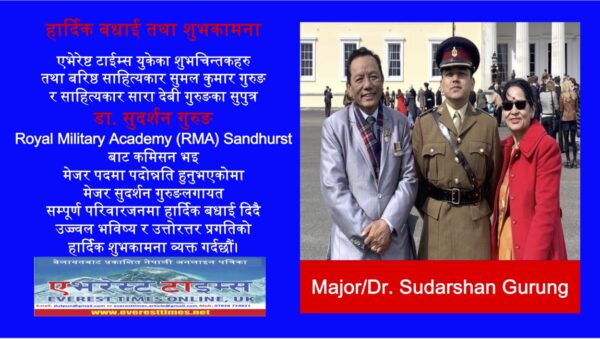 एभेरेष्ट टाईम्स युकेका शुभचिन्तकहरु तथा बरिष्ठ साहित्यकार सुमल कुमार गुरुङ र साहित्यकार सारा देबी गुरुङका सुपुत्र डा. सुदर्शन गुरुङ Royal Military Academy (RMA) Sandhurst बाट कमिसन भइ मेजर पदमा पदोन्नति हुनुभएकोमा मेजर सुदर्शन गुरुङ लगायत सम्पूर्ण परिवारजनमा हार्दिक बधाई दिदै उज्ज्वल भविष्य र उत्तोरत्तर प्रगतिको हार्दिक शुभकामना व्यक्त गर्दछौं।