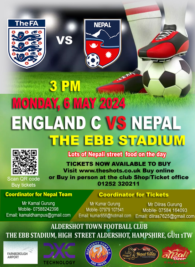 बेलायतको हाम्सायर प्रान्तमा अबस्थित अल्डरसट टाउन फुटबल क्लवले धेरै संघसंस्थाको सहयोगमा आगामी मे ६ तारिखका दिन नेपाली फुटबल टिम र इंग्ल्याण्ड सी टिमबीच ऐतिहासिक फुटबल खेल आयोजना गर्ने भइरहेको छ ।