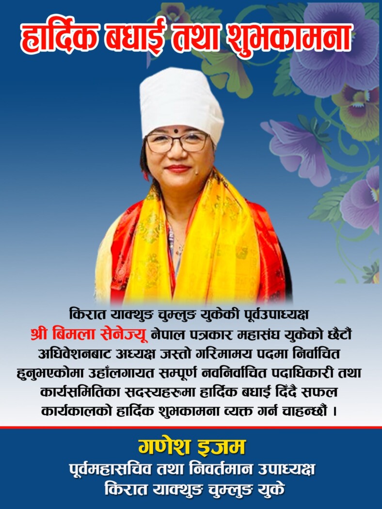 हार्दिक बधाई तथा शुभकामना : बिमला सेने (गणेश इजमबाट)