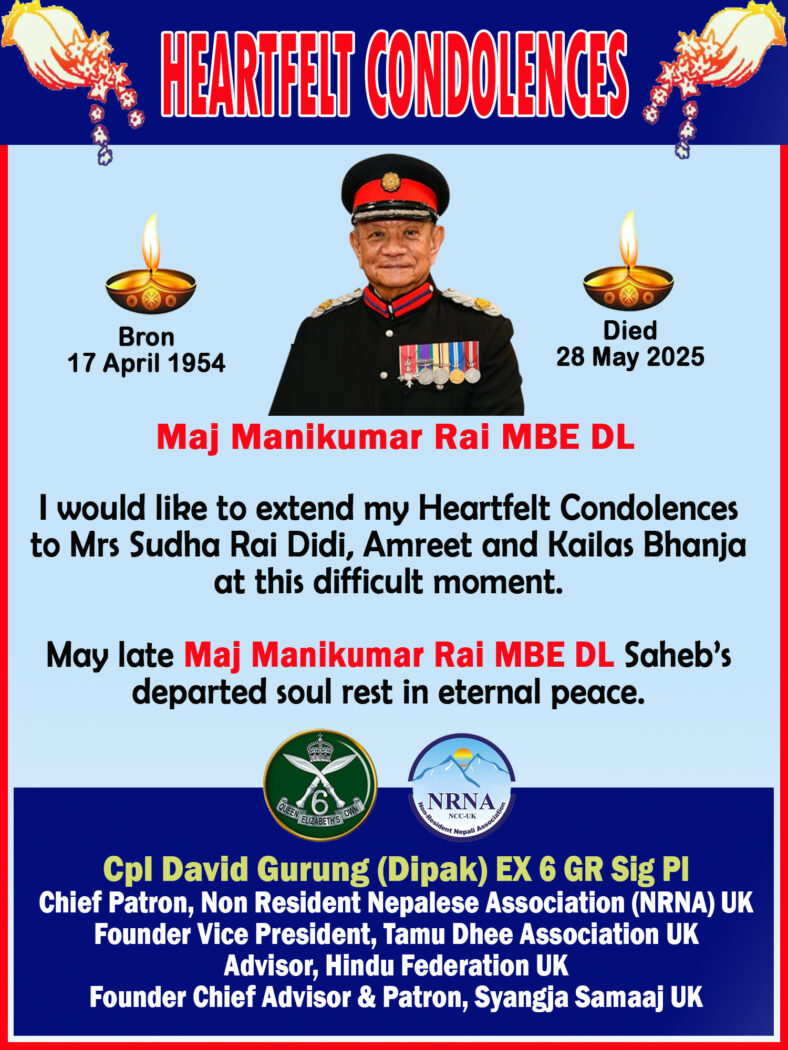HEARTFELT CONDOLENCES : MAJ MANIKUMAR RAI MBE DL
