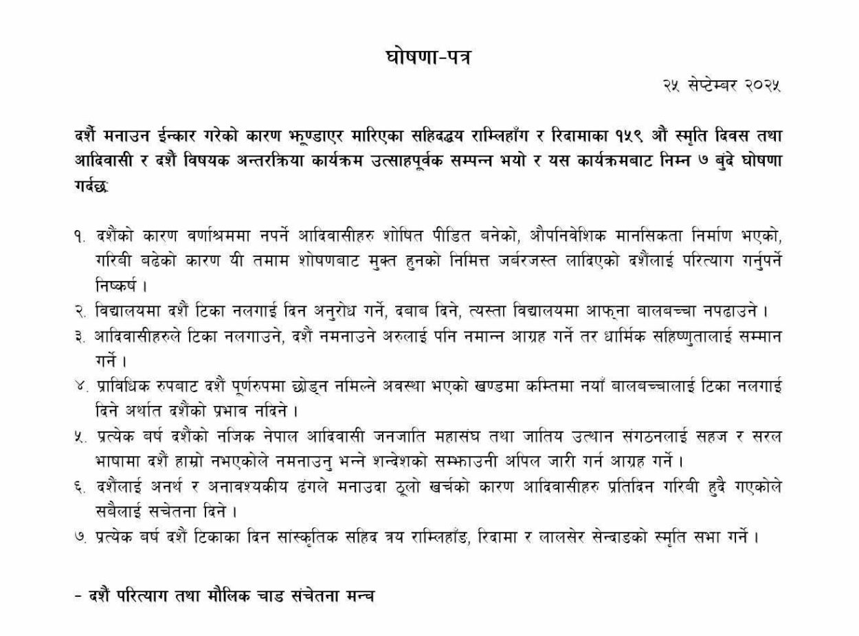 उक्त भर्चुअल अन्तरक्रिया कार्यक्रममा सहभागी तथा दशैं परित्याग तथा मौलिक चाड संचेतना मन्चले दर्शै मनाउन ईन्कार गरेको कारण झूण्डाएर मारिएका सहिदद्धय राम्लिहाङ र रिदामाका १५९ औं स्मृति दिवस तथा आदिवासी र दशैं विषयक अन्तरक्रिया कार्यक्रम उत्साहपूर्वक सम्पन्न भयो र यस कार्यक्रमबाट निम्न ७ बुंदे घोषणा पत्र जारि गरेको छ।