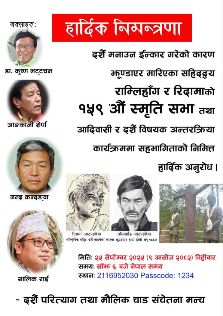 बेलायत – बिहिवार २५ सेप्टेम्वर २०२५ का दिन दशैं परित्याग तथा मौलिक चाड संचेतना मन्चले आदिवासी र दसैं विषयक अन्तरक्रिया कार्यक्रम सम्पन्न गरेको छ । साँस्कृतिक सहिद राम्लिहाङ र रिदामा आठपहरियाको १५९ औ स्मृति दिवसको अवसरमा भर्चुअल अन्तरक्रियामा अगुवा बुद्धिजीवी एवम् साँस्कृतिक अभियन्ताहरूबाट विचार प्रस्तुति एवम् सहभागीहरूबीच प्रश्नोत्तर कार्यक्रम भएको हो ।