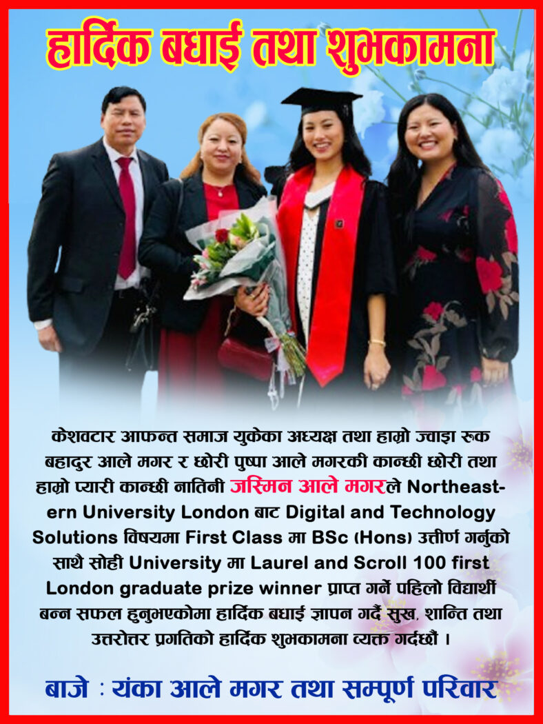 हार्दिक बधाई तथा शुभकामना : जस्मिन आले मगर